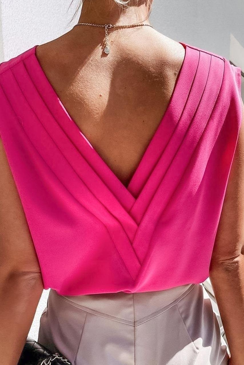 Άκρως καλοκαιρινή αμάνικη μπλούζα σε office glam στυλ σε φούξια χρώμα, με άνοιγμα πίσω, V μπροστά και μοναδικά cap sleeves μανίκια που καλύπτουν μέρος από τα μπράτσα.