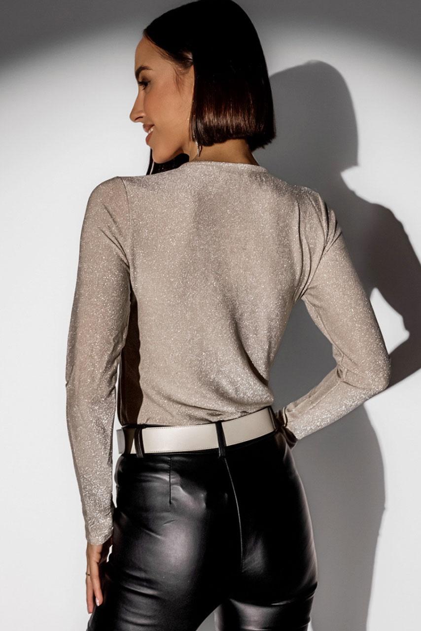 Partywear τοπ λούρεξ με V neck λαιμόκοψη και μεταλλιζέ υφή σε μπεζ χρώμα.