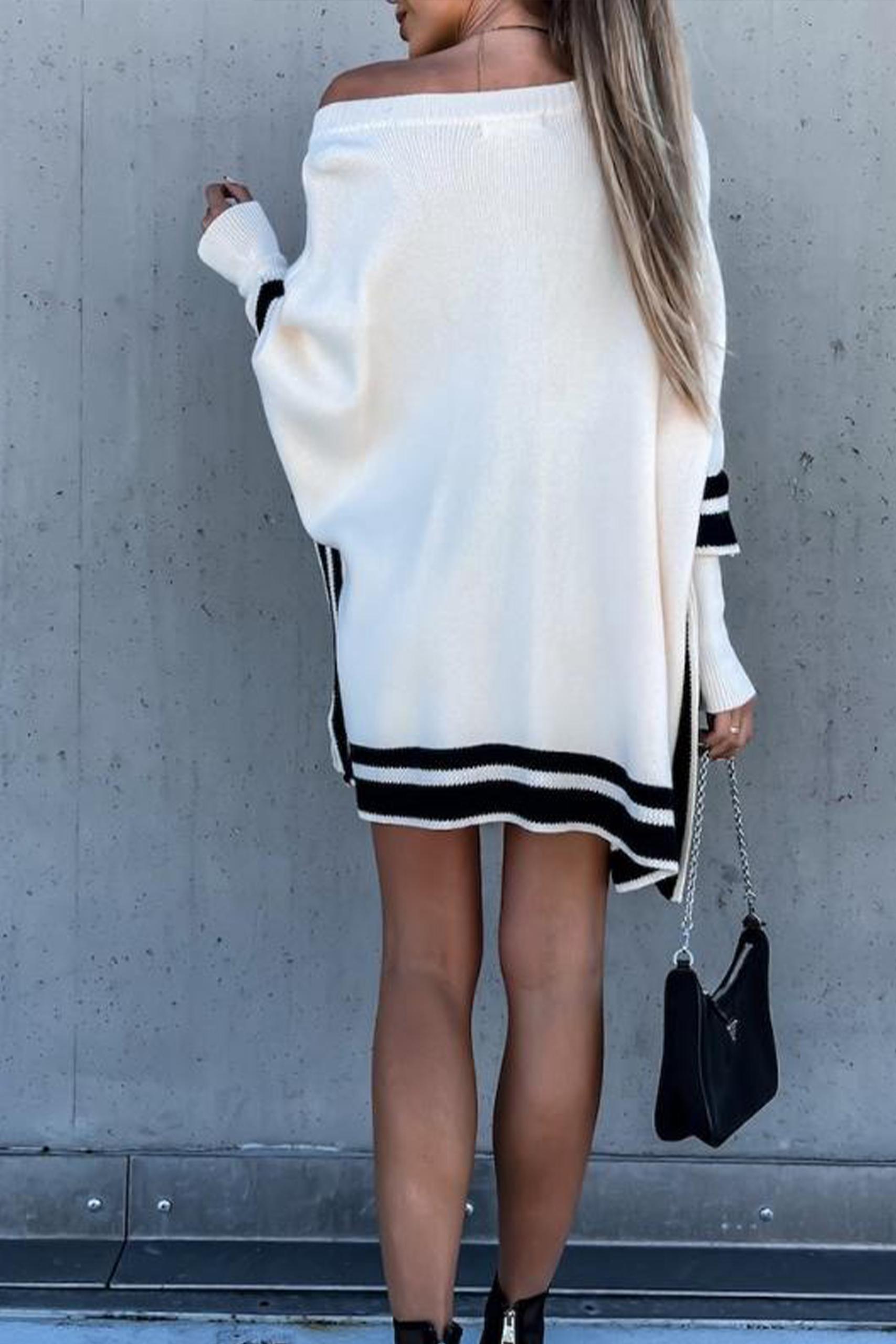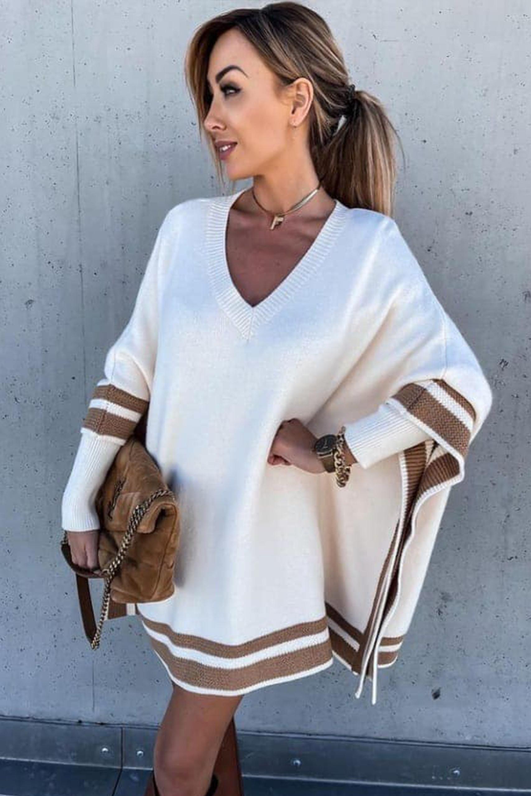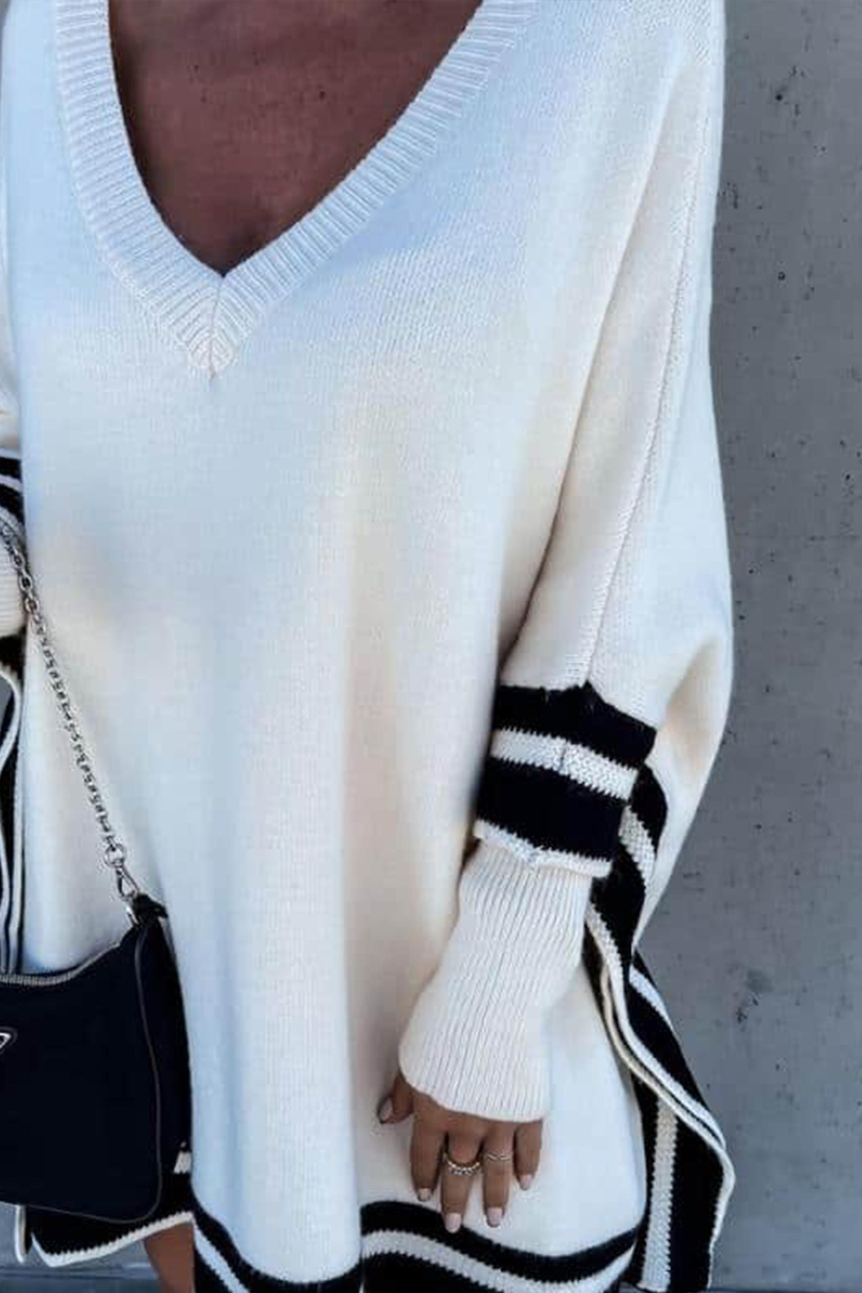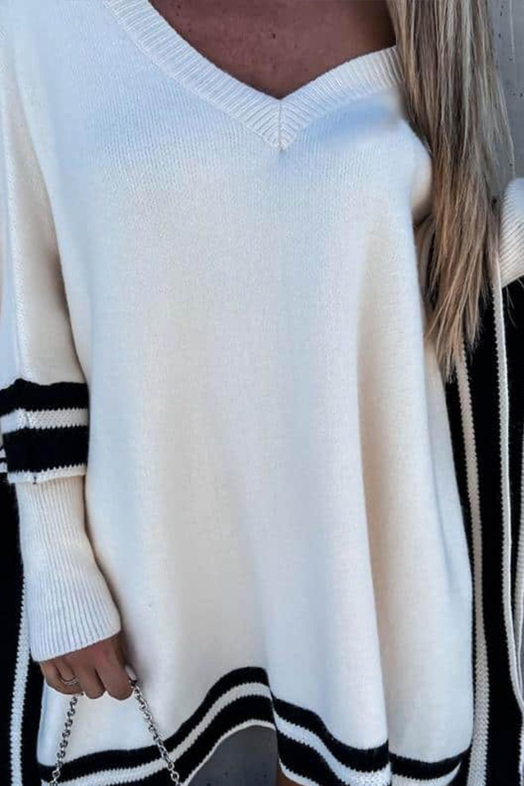 V neck ασύμμετρο τοπ σε off white απόχρωση με λεπτομέρεια καφέ ή μαύρη ρίγα στο τελείωμα.