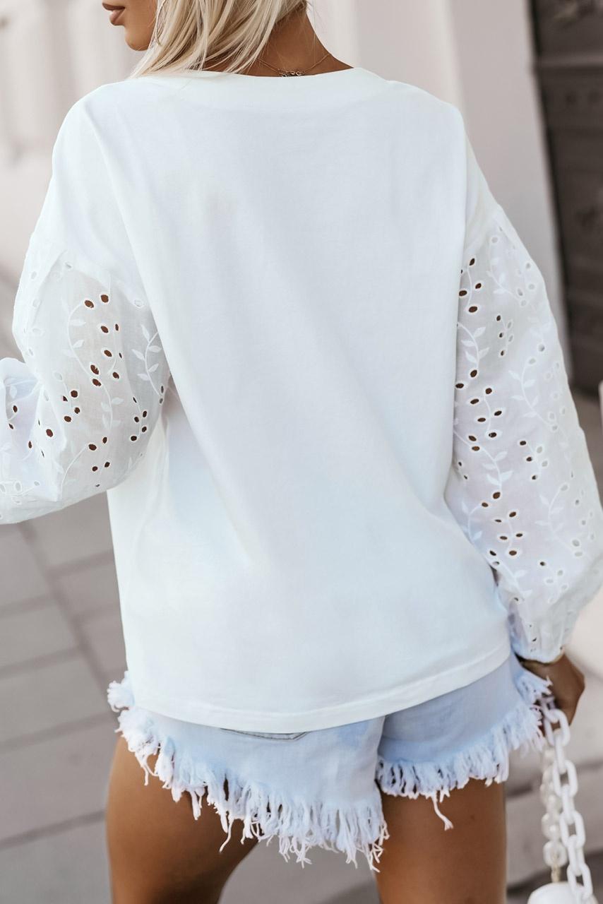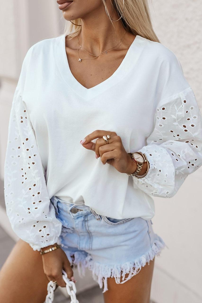 Άσπρο μπλουζάκι με ντεκολτέ και φουσκωτά διάτρητα μανίκια. Ένα must have άσπρο μπλουζάκι που δεν πρέπει να λείπει από την φθινοπωρινή σου συλλογή.
