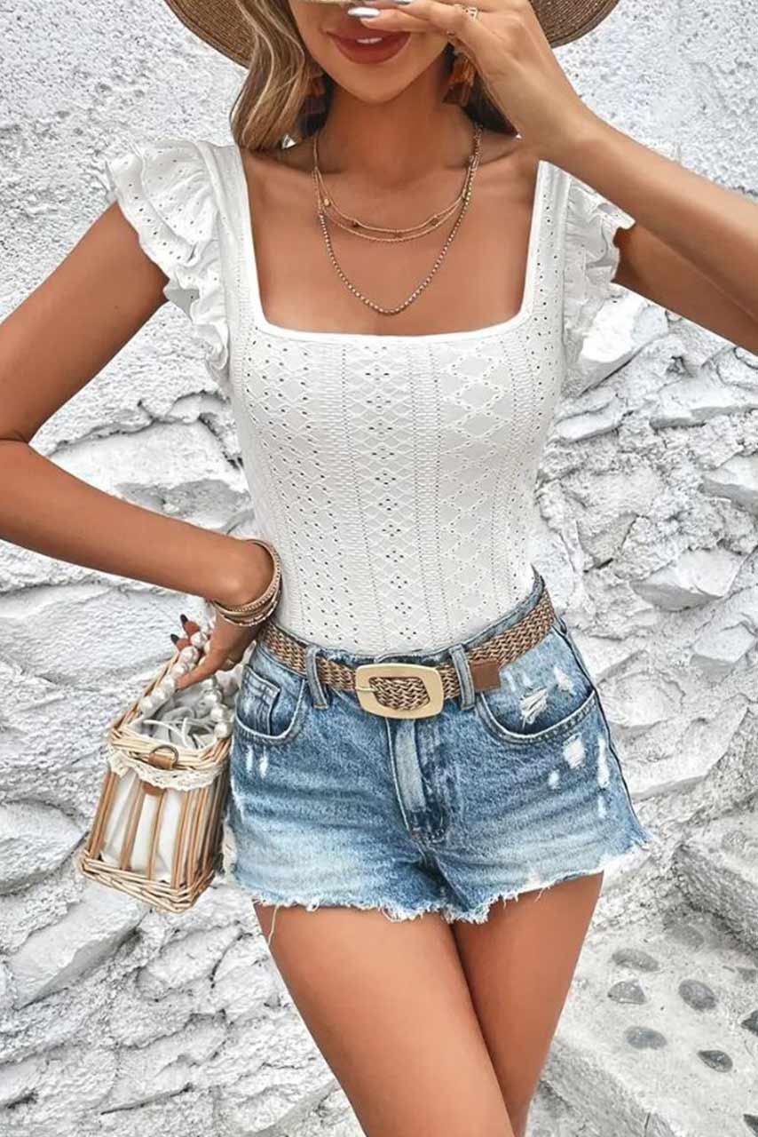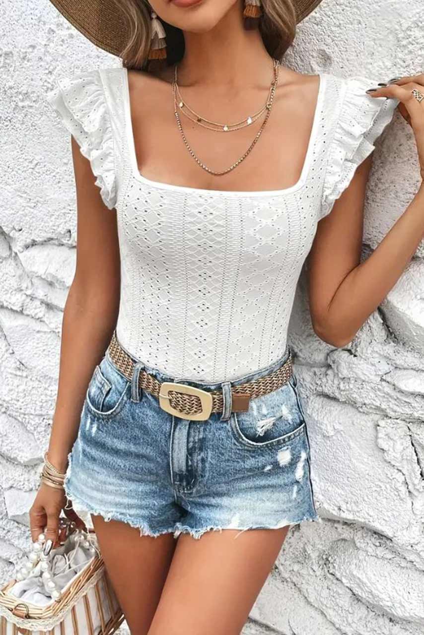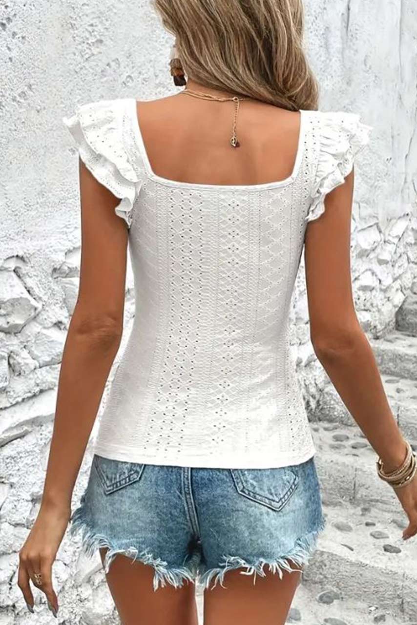 Embroidered detail λευκό τοπ με λεπτομέρειες βολάν στα μανίκια. Ένα καλοκαιρινό κομμάτι που δεν πρέπει να λείπει από την συλλογή σου.
