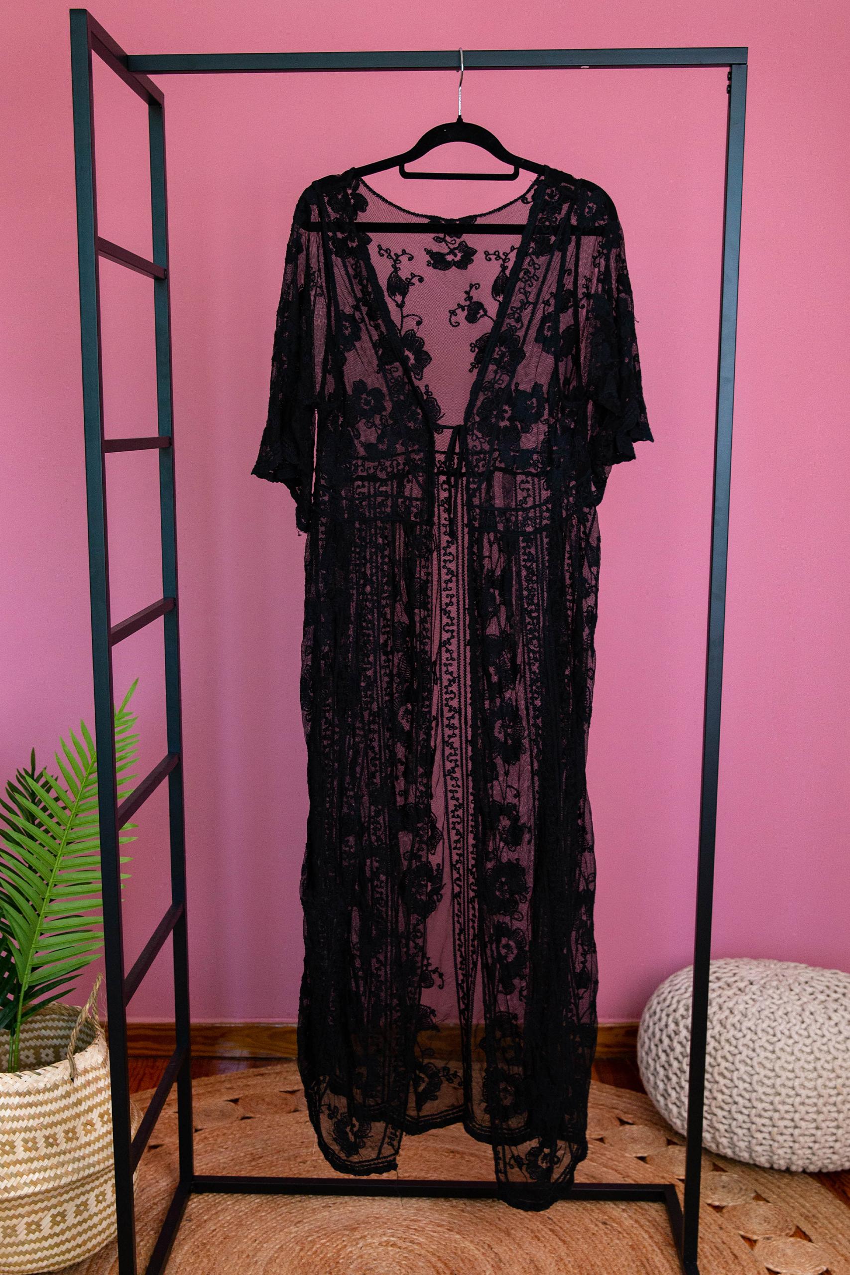 • Μαύρο κιμονό παραλίας | Κορδόνι για δέσιμο στη μέση