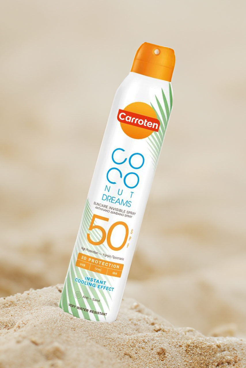 Το Carroten πηγαίνει την αντηλιακή προστασία ένα βήμα μπροστά προσφέροντας ολιστική 3D προστασία απέναντι στις 3 πιο επιβλαβείς για την επιδερμίδα ακτινοβολίες (UVA+UVB+IRA).Το διάφανο αντηλιακό mist, Carroten Coconut Dreams SPF50, προφέρει άμεση απορρόφηση, χωρίς υπολείμματα λιπαρότητας.