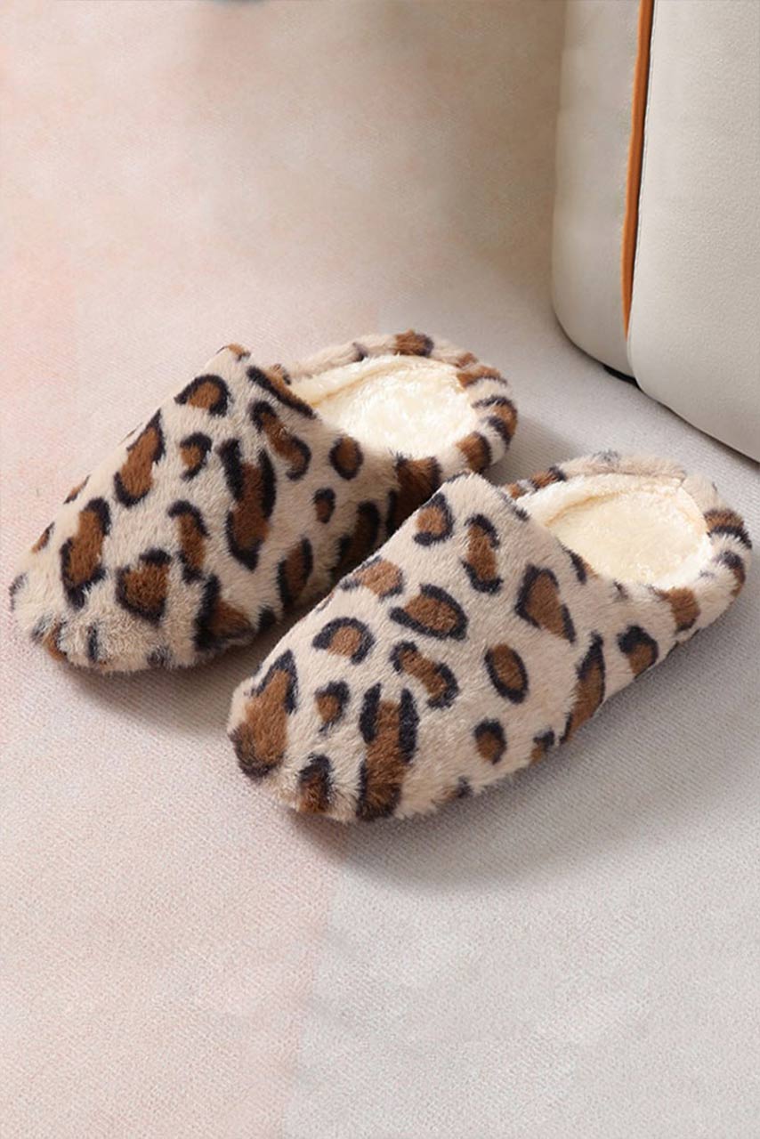 Άνετες λεπτές γούνινες παντόφλες σε leopard animal print σχέδιο.
