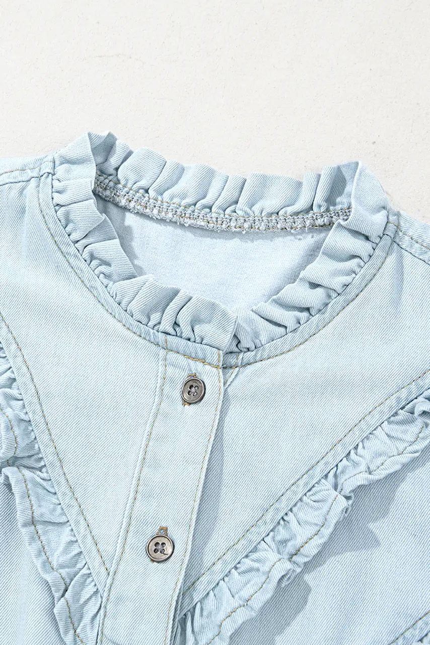 Το denim αποκτά ρομαντική διάθεση και κάνει statement αυτό το καλοκαίρι! Το αμάνικο πουκάμισο από ανοιχτόχρωμο denim είναι η τέλεια προσθήκη για ένα stylish καλοκαιρινό outfit. Με παιχνιδιάρικα βολάν κατά μήκος του μπούστου και των ώμων, χαρίζει μια girly πινελιά στο πιο διαχρονικό ύφασμα.