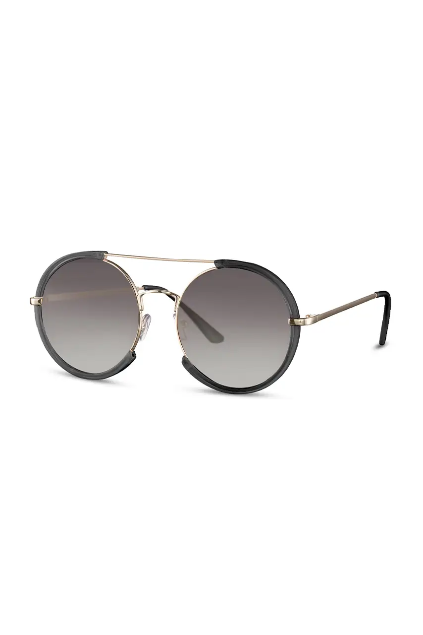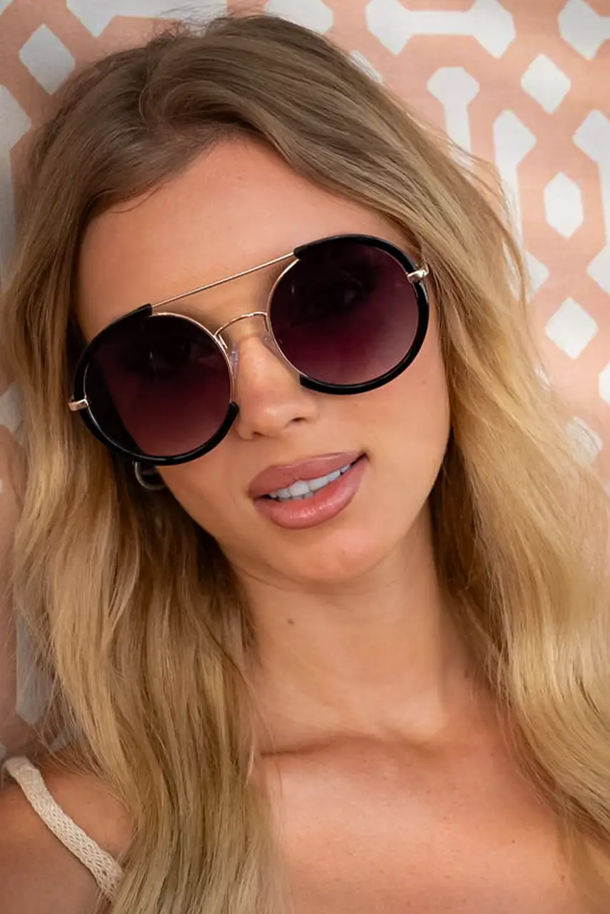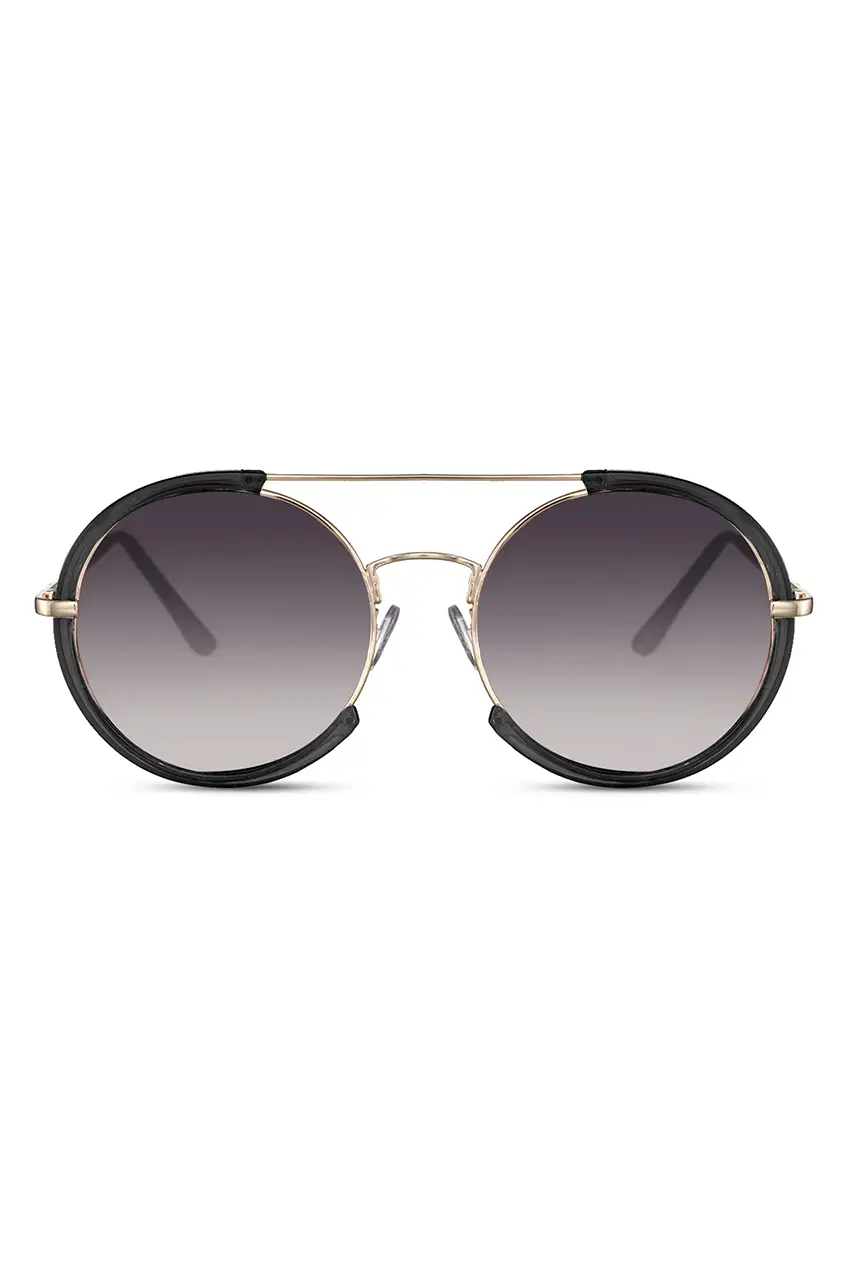 Δώστε νέα διάσταση στο στυλ σας με αυτά τα oversized γυναικεία γυαλιά ηλίου που συνδυάζουν έντονη εμφάνιση και κορυφαία προστασία. Ο κομψός σκελετός σε μαύρο και χρυσό συνδυασμό κατασκευάζεται από μεταλλικό και πολυανθρακικό υλικό, προσφέροντας ταυτόχρονα στιβαρότητα και άνεση. Οι στρογγυλοί πολυανθρακικοί φακοί είναι διαβαθμισμένοι σε μαύρο χρώμα, εξασφαλίζοντας 100% UV προστασία κατηγορίας 3.