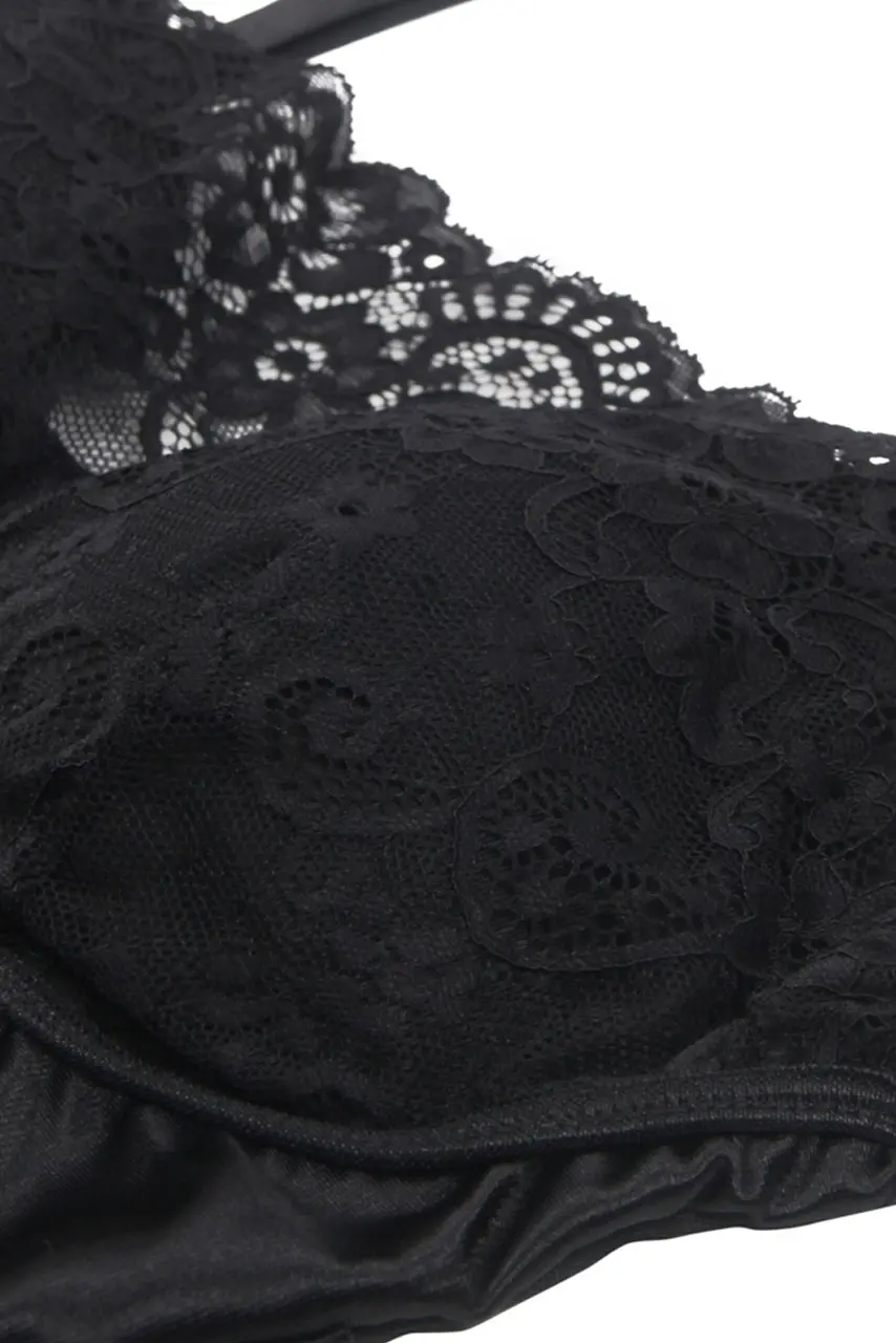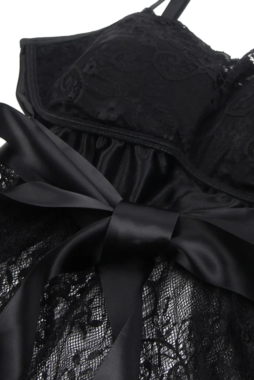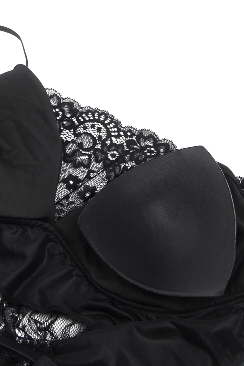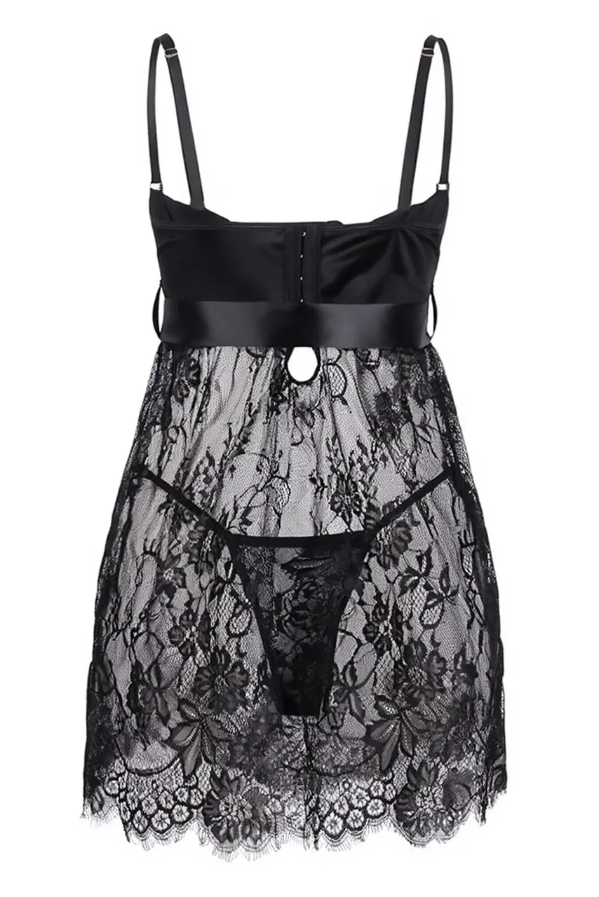Glam babydoll lingerie σετ με push up ρυθμιζόμενες τιράντες και σατέν ζώνη από δαντέλα με σχέδια λουλούδια all over και tong slip.