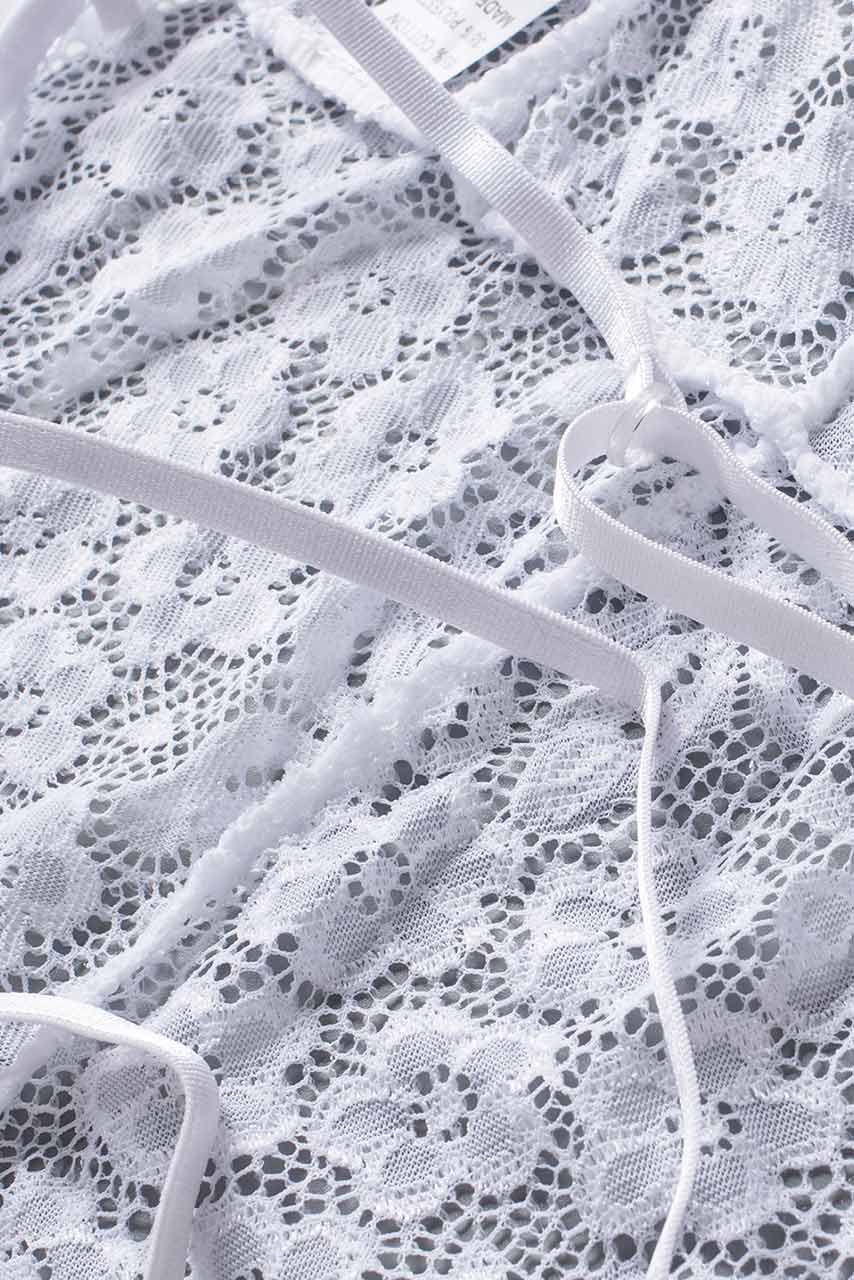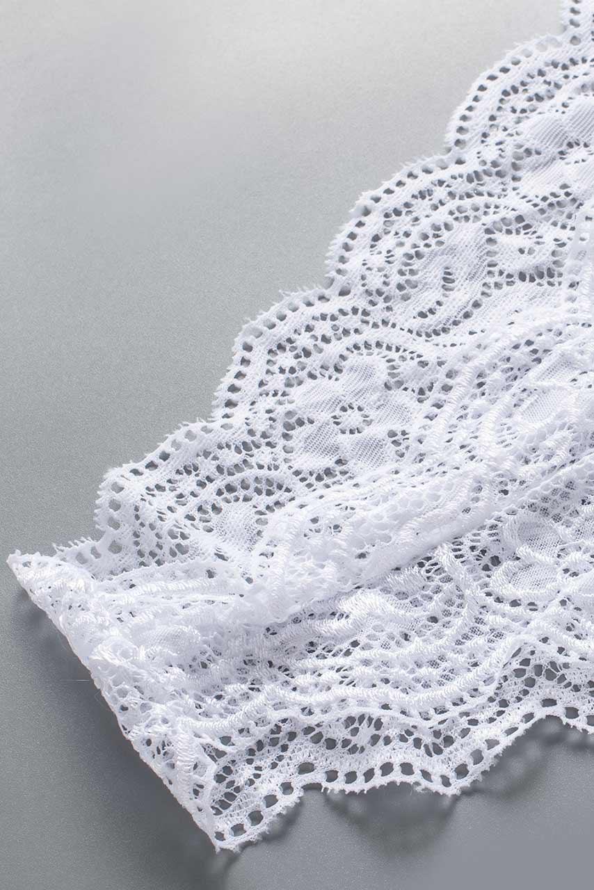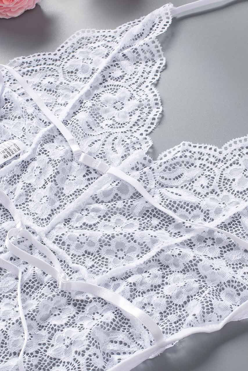 Λευκό ρομαντικό scalloped V λαιμόκοψη δαντελένιο κορμάκι με σχέδια λουλουδιών.