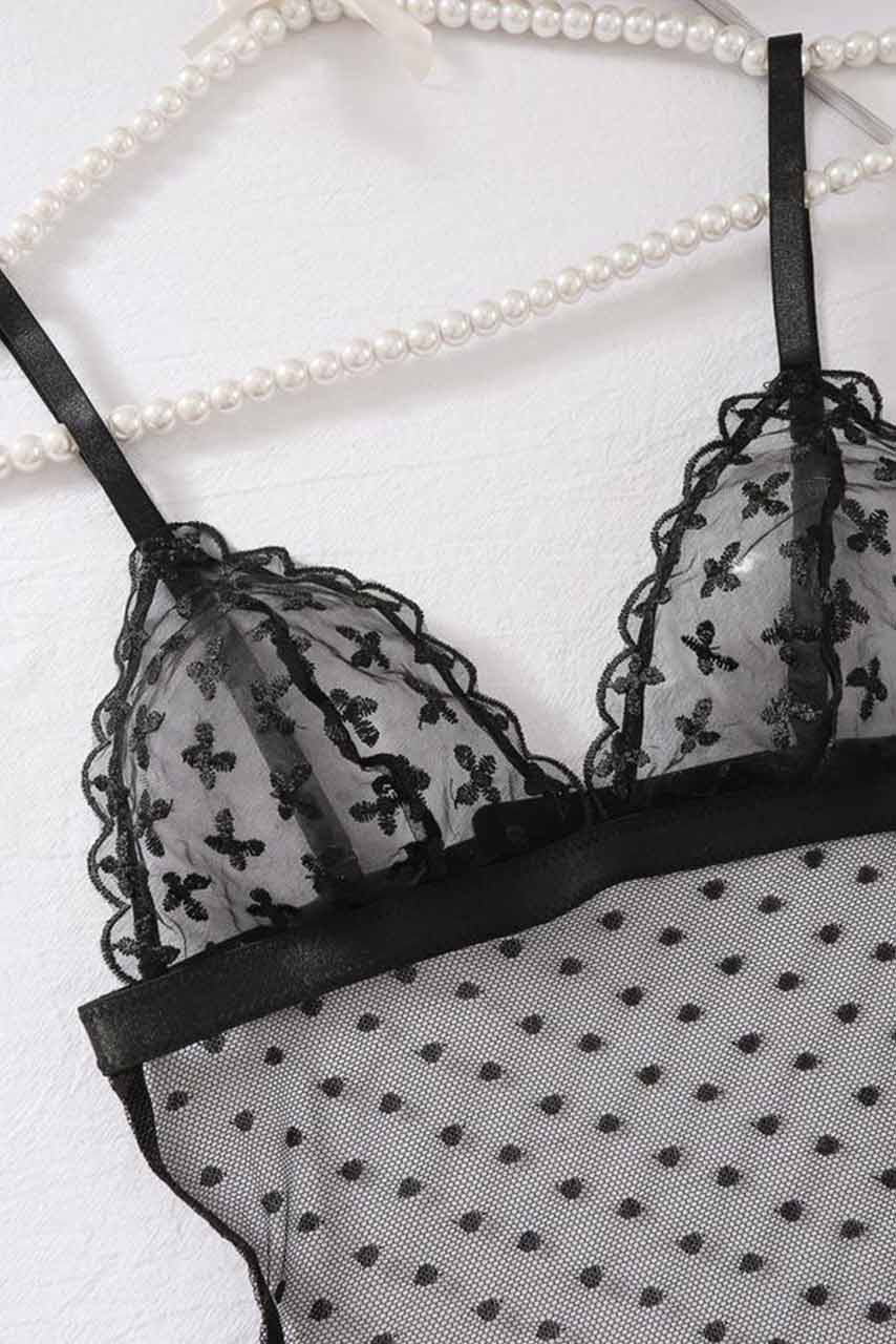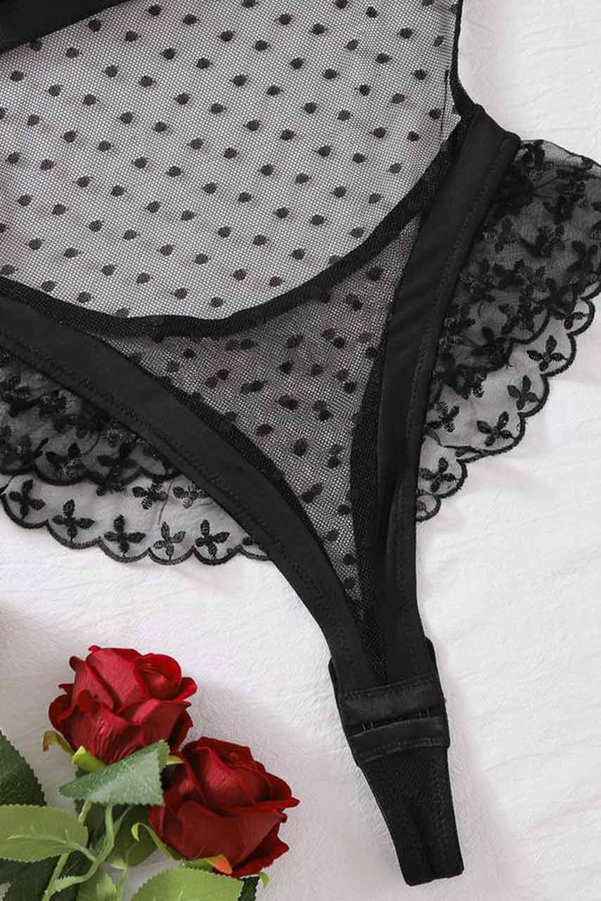Εξώπλατο διάφανο ολόσωμο lingerie, με μπαλκονέ ντεκολτέ και βολάν με κεντήματα.