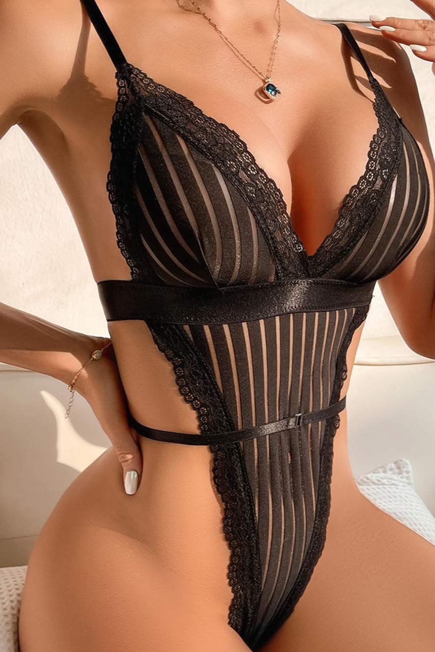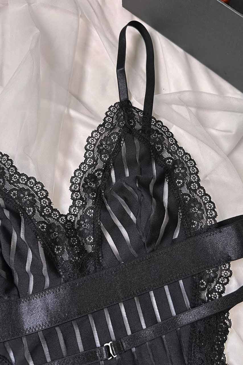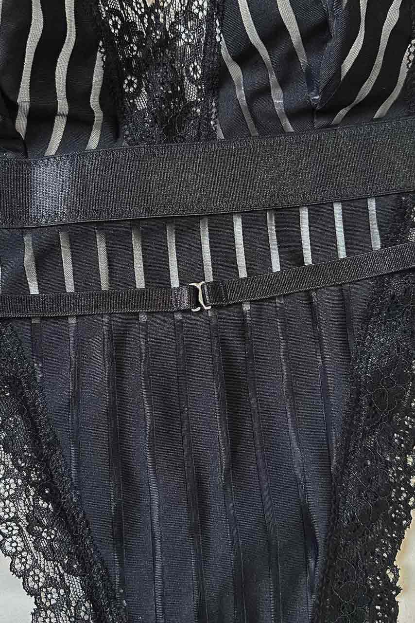 Glam mesh κορμάκι με ριπ διαφάνειες  και δαντέλα  σε μαύρο χρώμα με deep V neck και χαμηλή πλάτη.