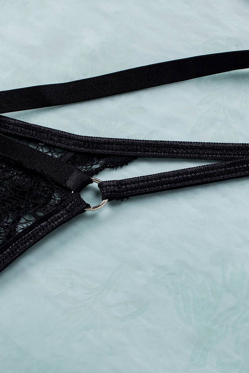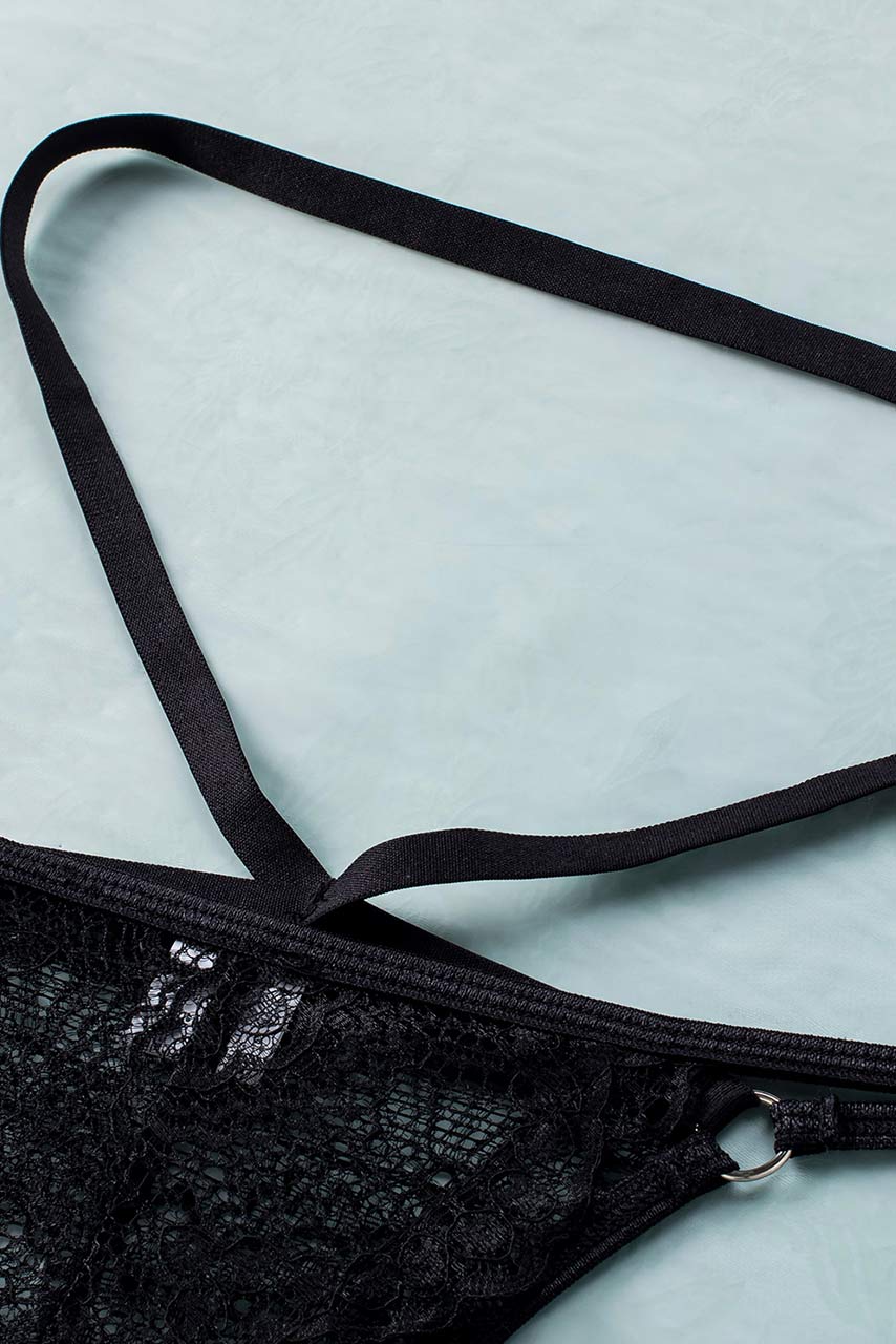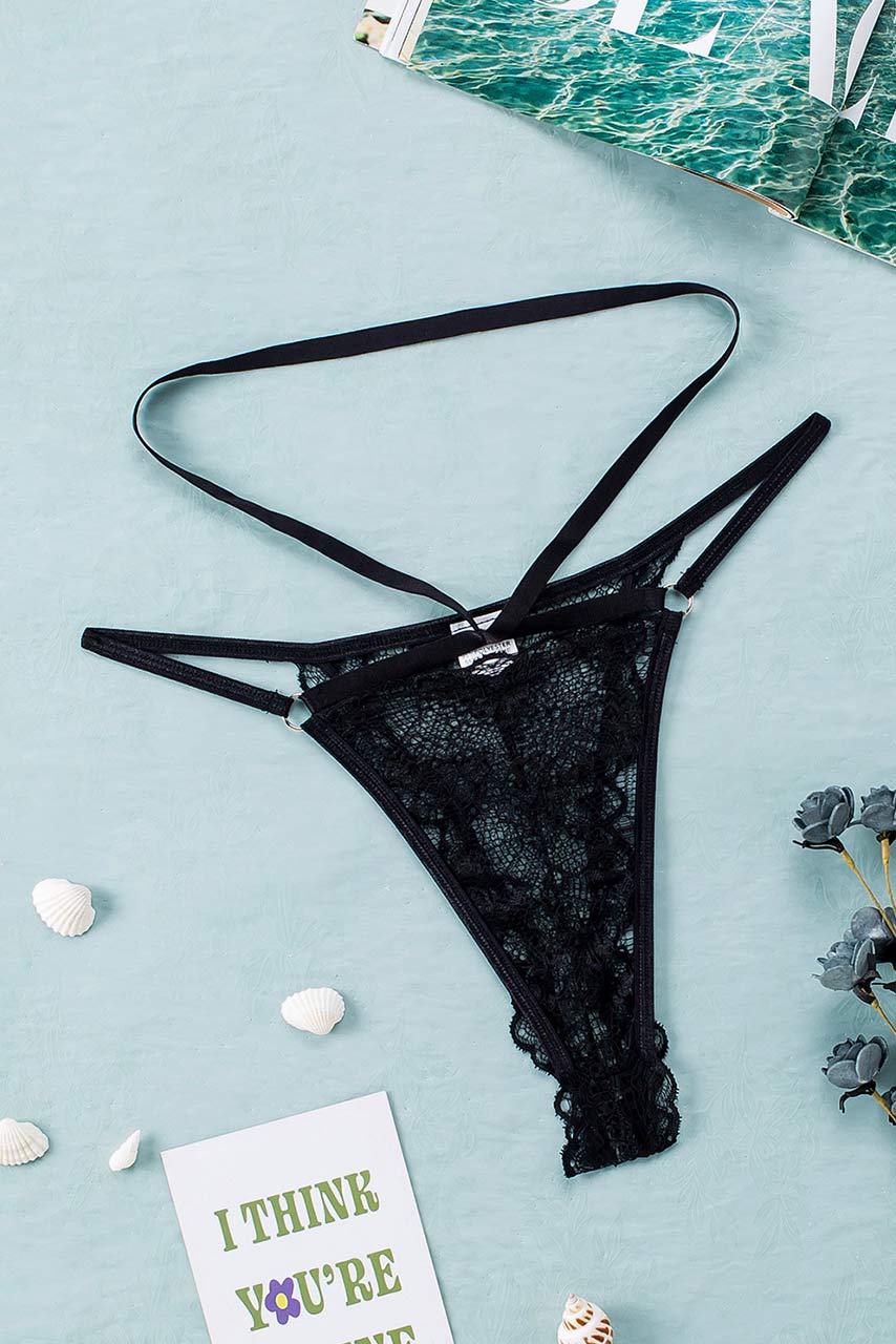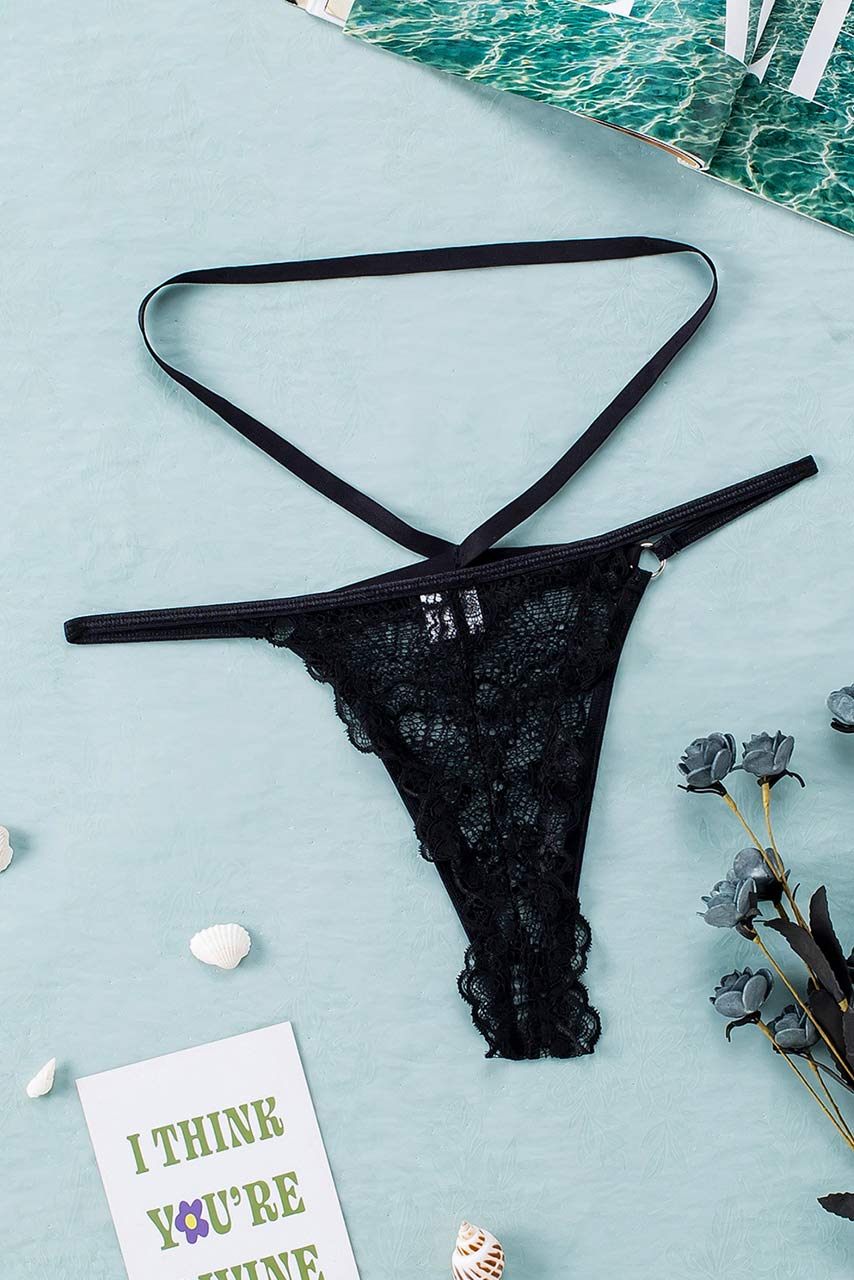 Ελκυστικό δαντελένιο μαύρο thong με ρυθμιζόμενα κορδόνια.
