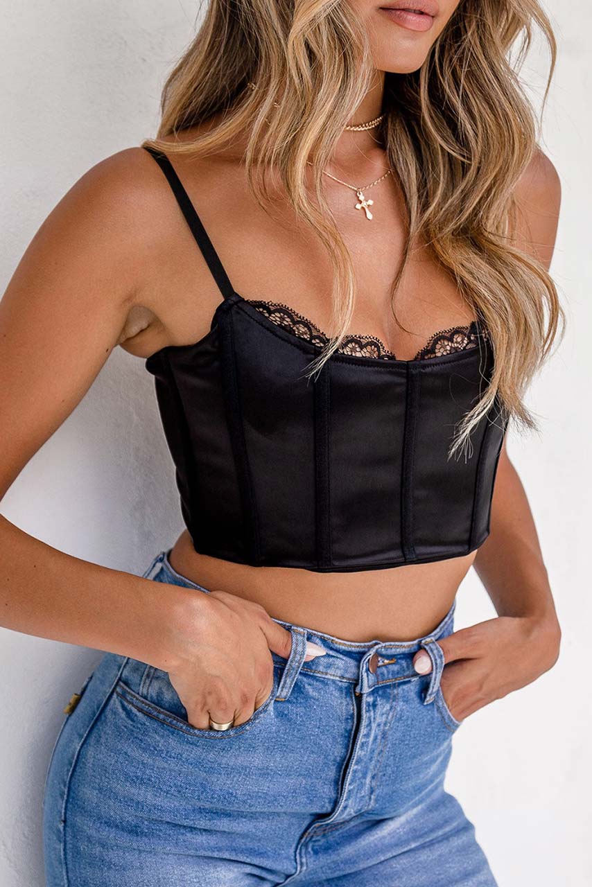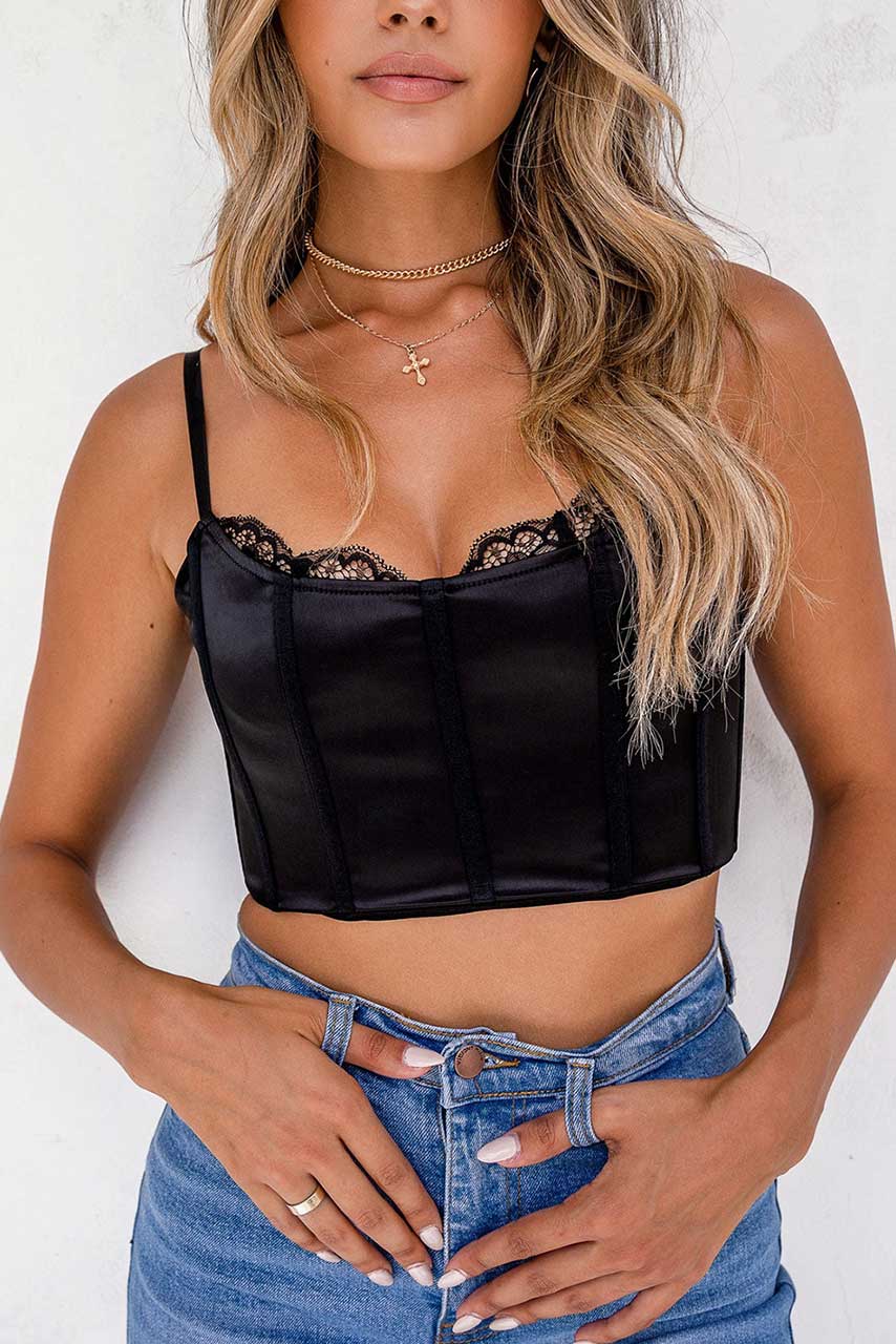 Μαύρο σατέν μπουστάκι με τιράντες και λεπτομέρειες δαντέλας. Συνδυάσετε το τους καλοκαιρινούς μήνες με το ψηλόμεσο σορτσάκι ή το τζίν σου.