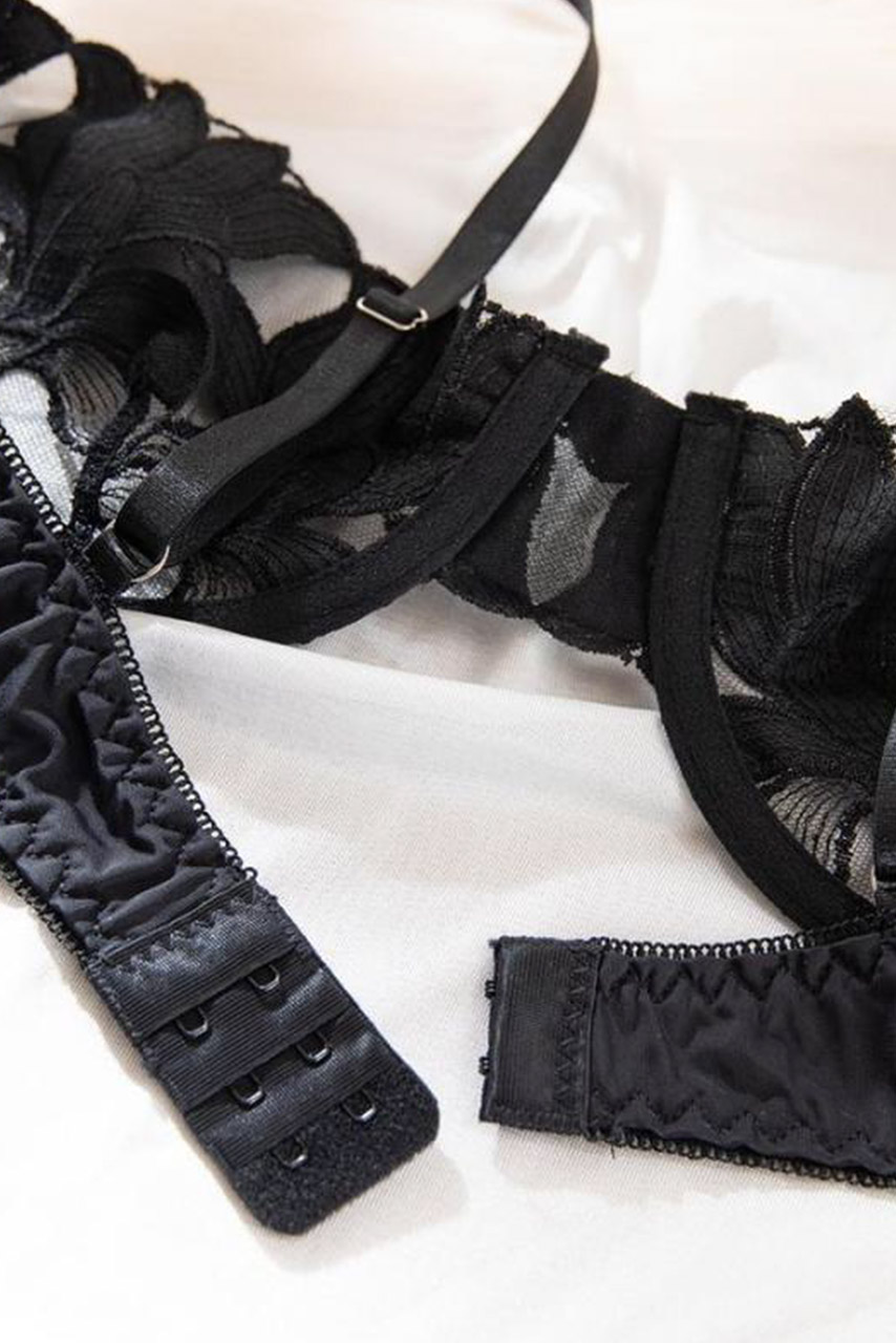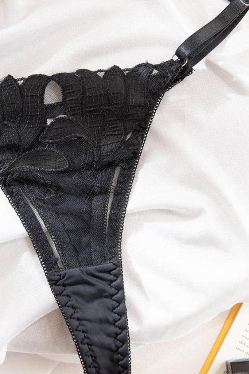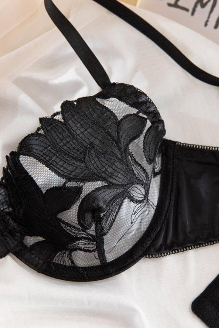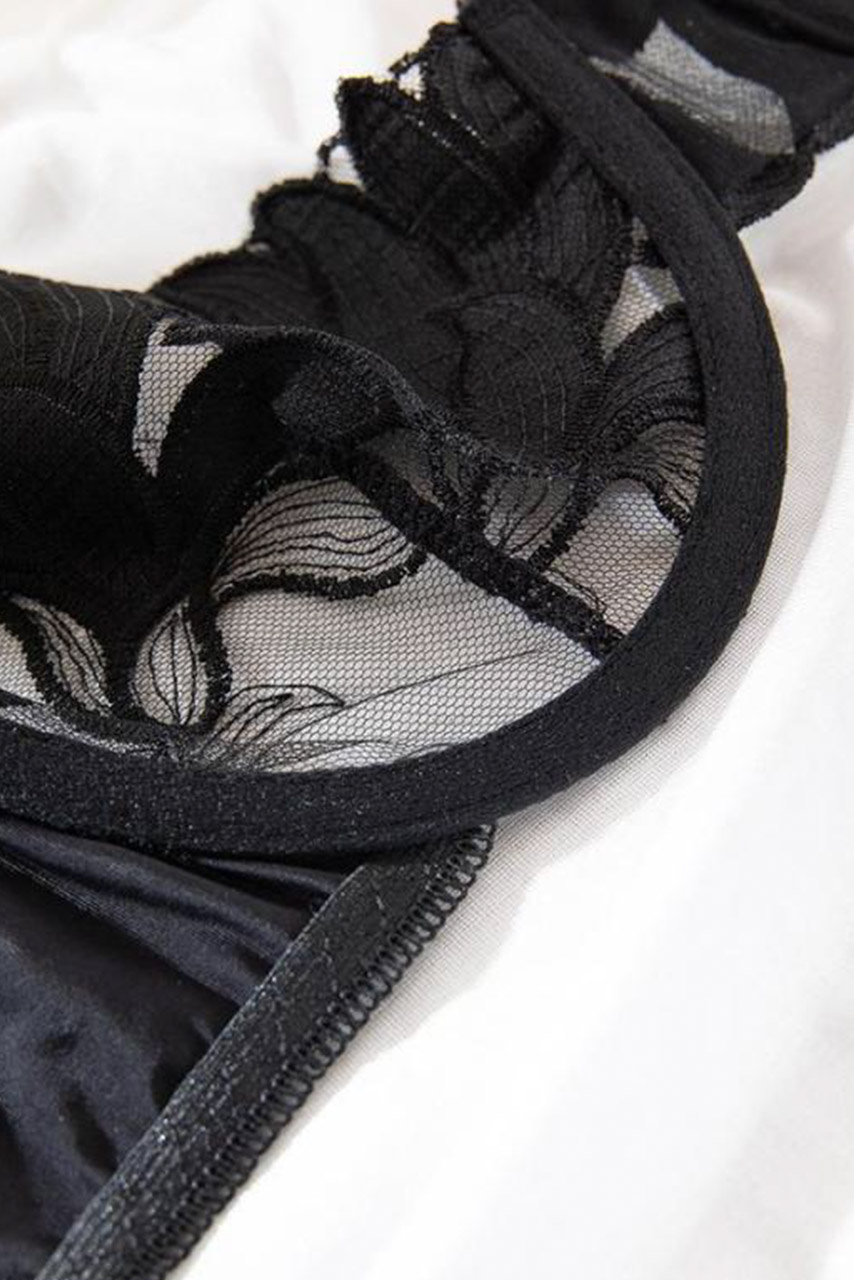 Μαύρο διάφανο σετ εσωρούχων με κεντημένα λουλούδια. Εχει στενή εφαρμογή και βγαίνει σε νουμεράκια.