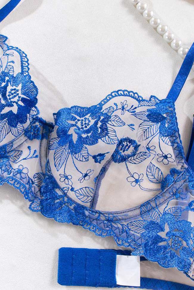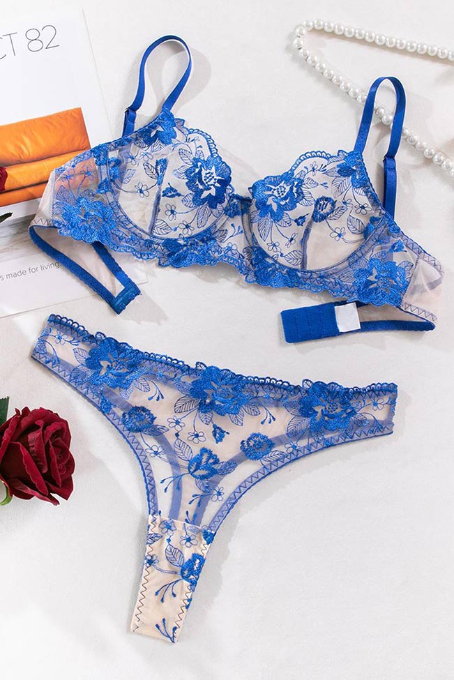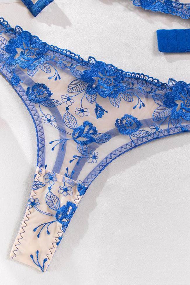 Retro balconette σετ με floral κεντήματα σε μπλε με push up σουτιέν χωρίς ενίσχυση και ψηλόμεσο σλιπ.