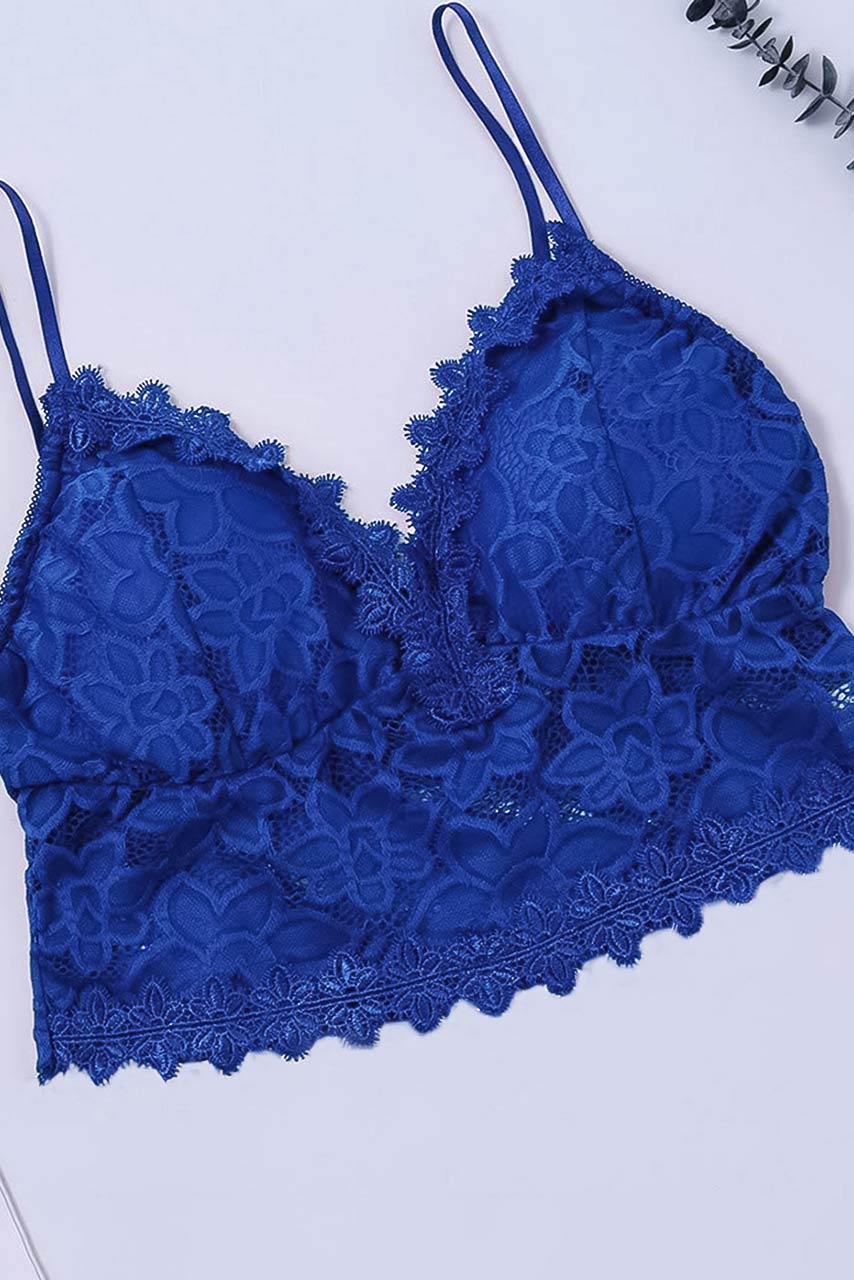 Must have μπλε bralette με δαντέλα, θα αναδείξει το μπούστο σου και ταιριάζει με τα πάντα ντουλάπα σου. Έχει spaghetti straps, V-neck, μαύρη δαντέλα και crop κόψιμο.