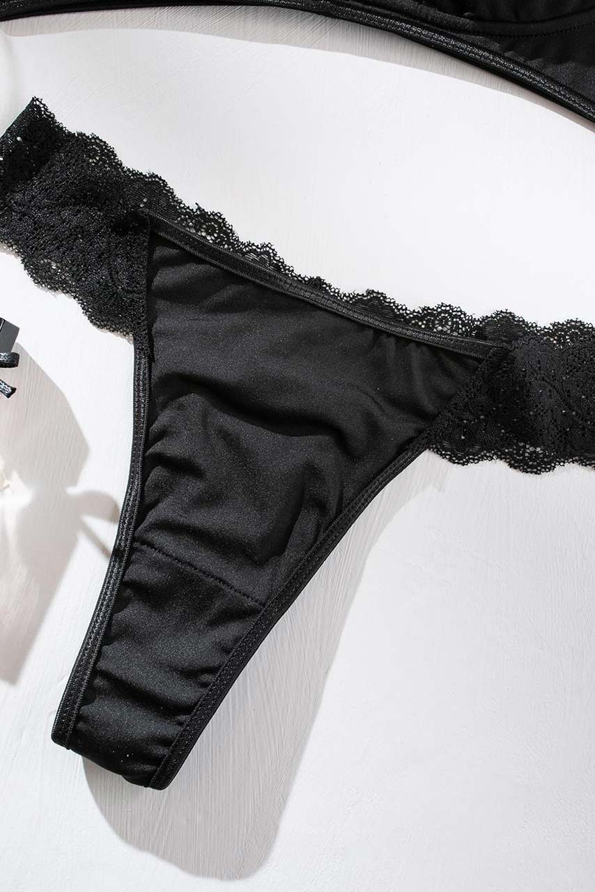 Μαύρο σετ με μπουστάκι και high cut bottom και λεπτομέρειες δαντέλας. Έχει φαρδιές ρυθμιζόμενες τιράντες.