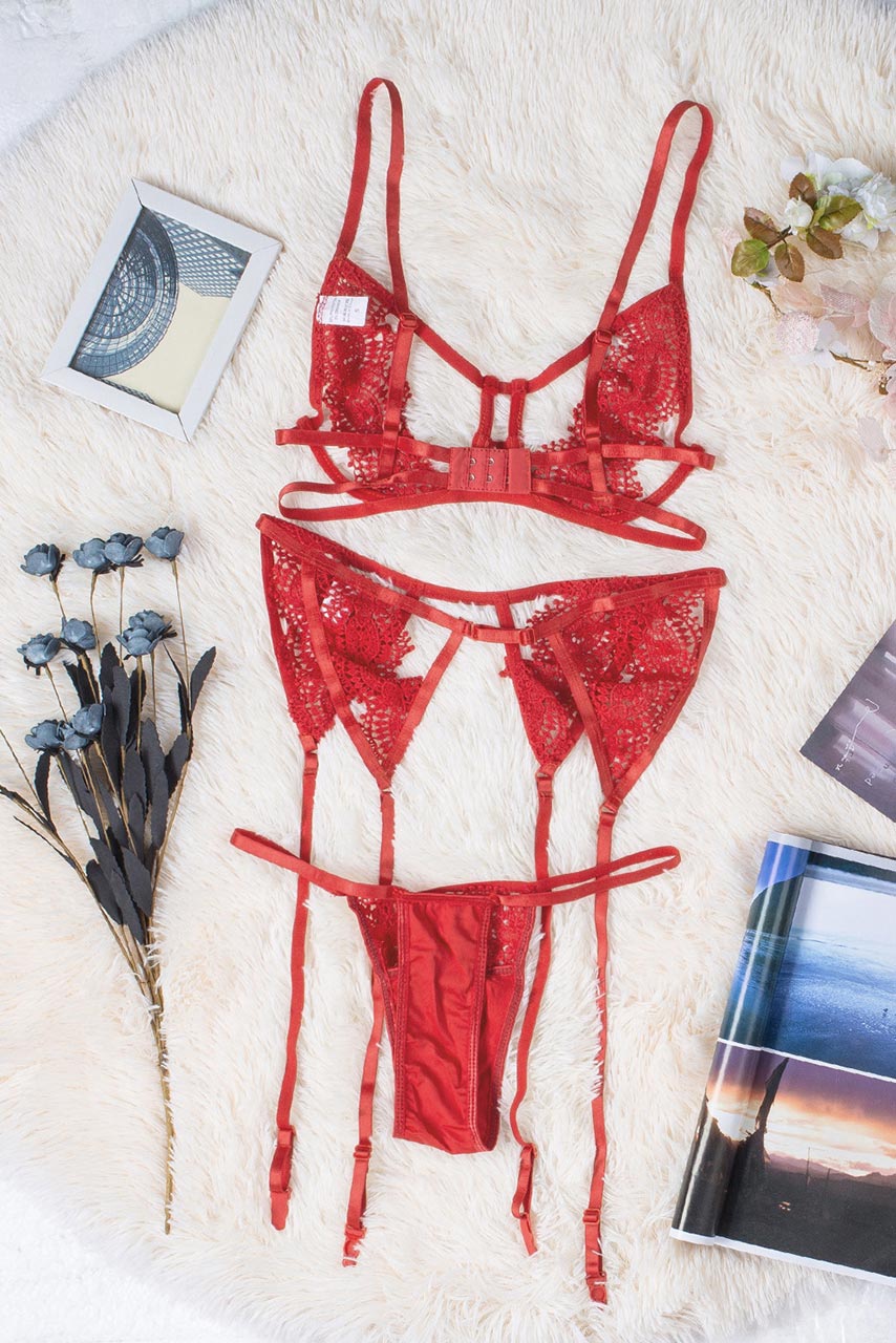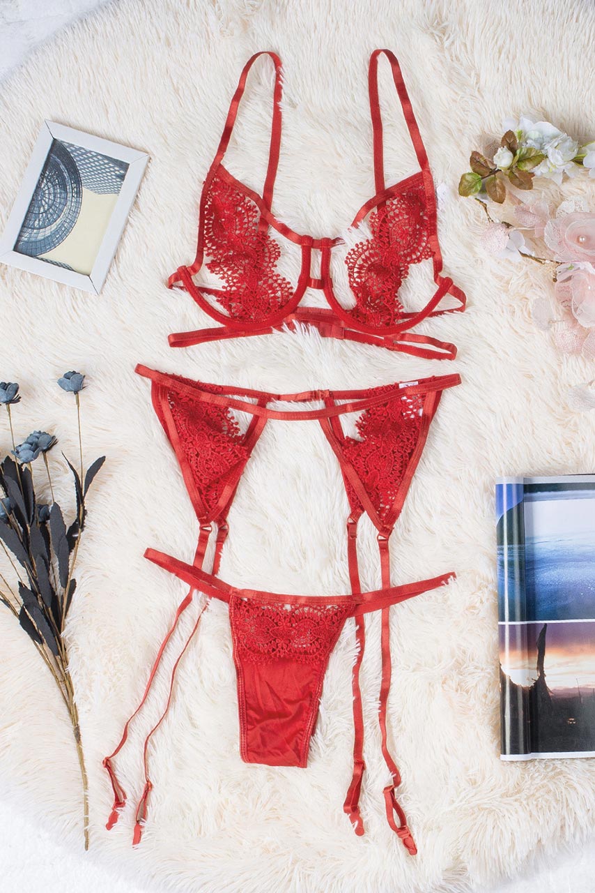 Glam sexy διάφανο 3-pieces σετ δαντέλας με cut outs σε κόκκινο χρώμα με ζαρτιέρες.