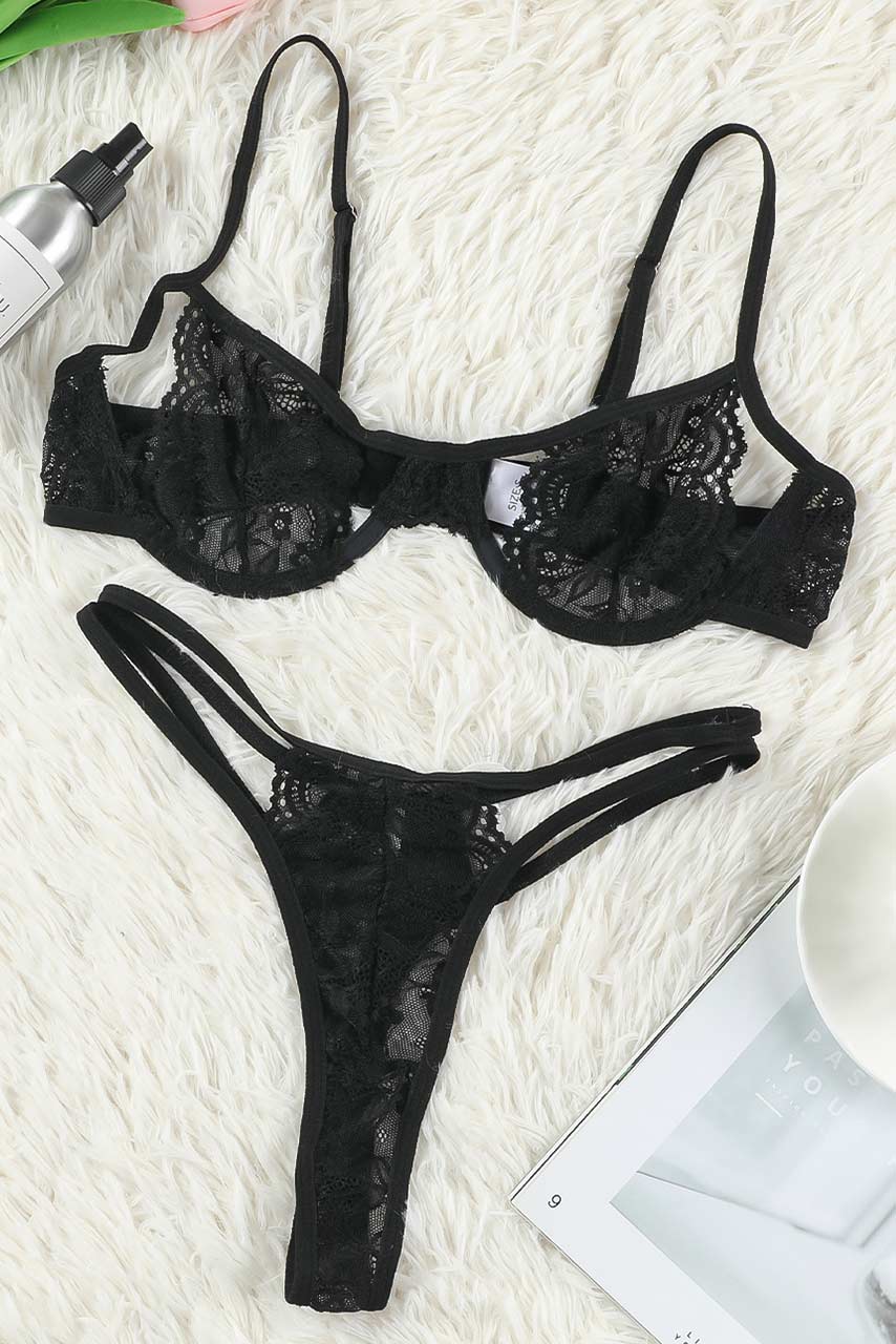 Cut out σετ εσωρούχων σε μαύρο χρώμα. To σλιπ σε G-string κόψιμο με spaghetti straps. Η εφαρμογή του είναι κανονική και βγαίνει σε μεγέθη από Small έως Large.