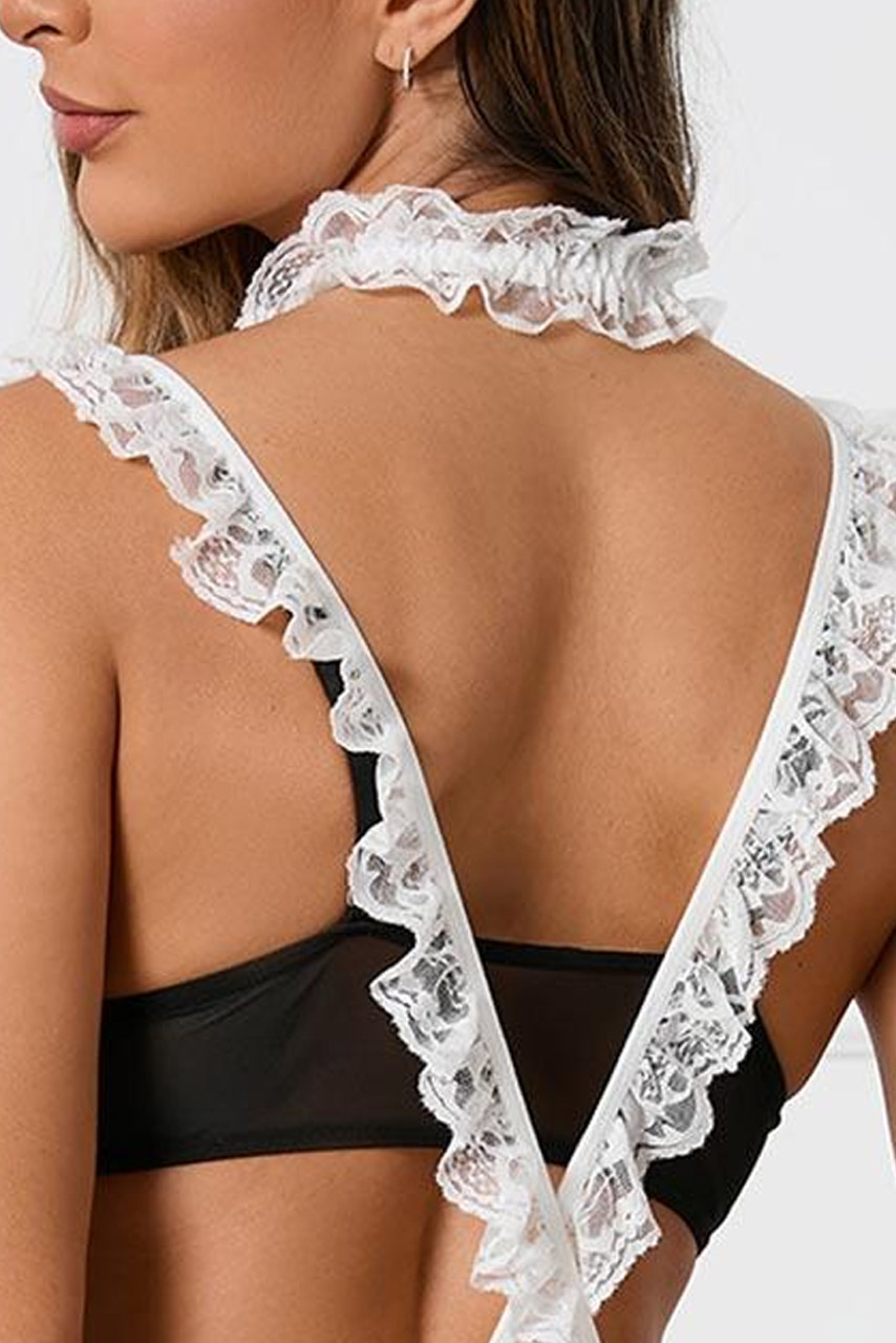 Παιχνιδιάρικο french maid cosplay σετάκι εσωρούχων για καυτές βραδιές. Αποτελείται από ένα διάφανο mesh μπούστο και string με βολάν καθώς και μια λευκή ποδιά που κάνει χιαστί στην πλάτη.