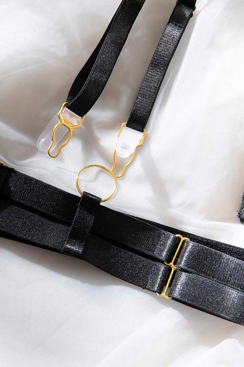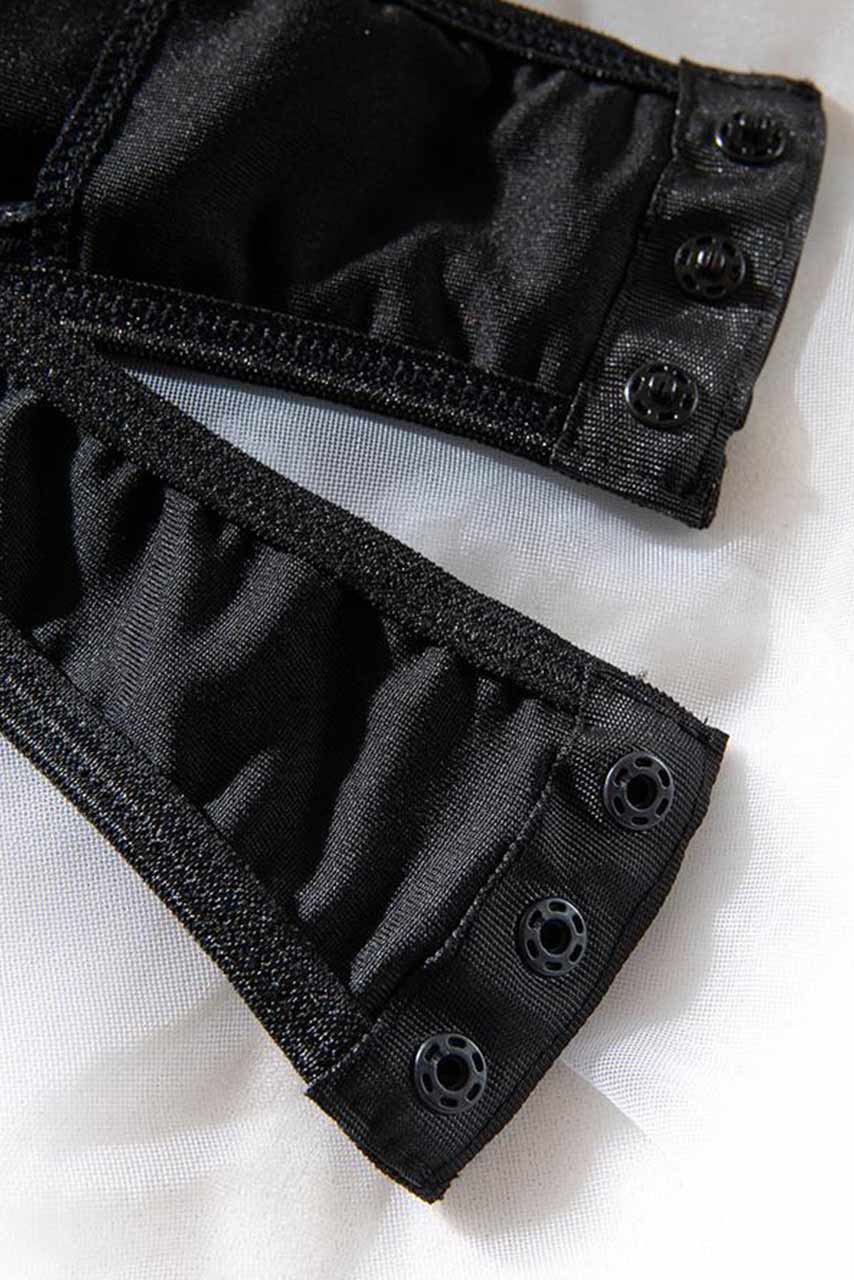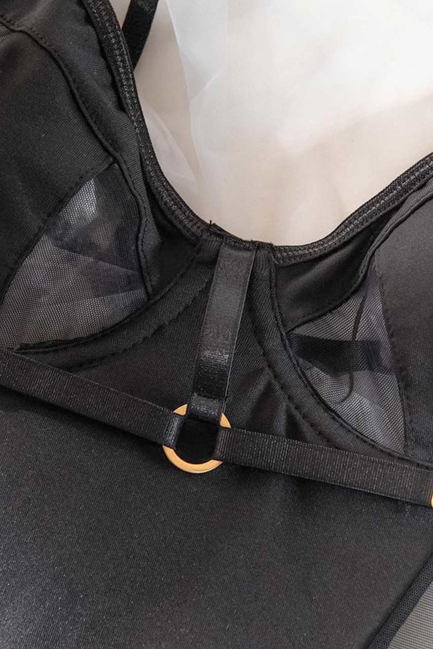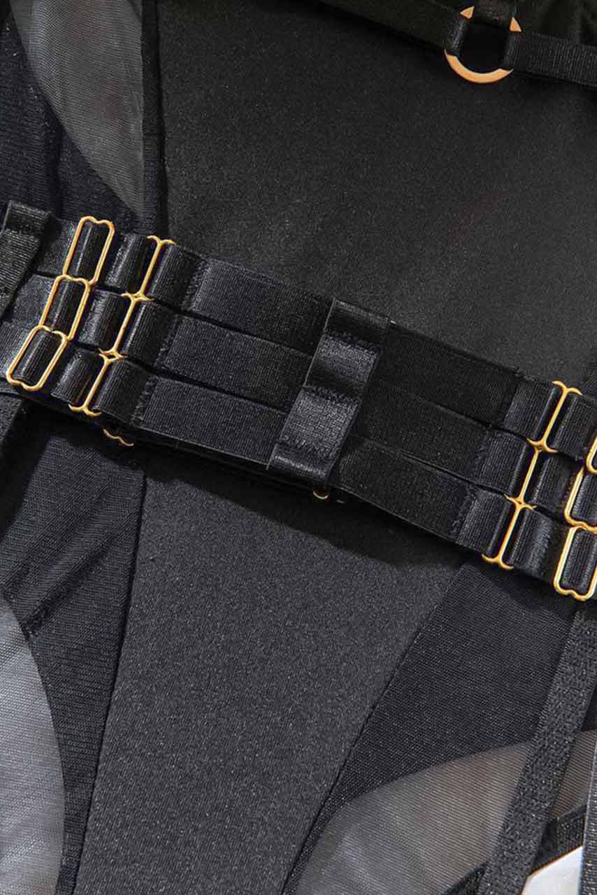 Ολόσωμο bodysuit σε μαύρη απόχρωση, με mesh διαφάνεια hollow out. Οι τιράντες είναι ρυθμιζόμενες και είναι ημιδιάφανο σε όλο το μήκος του. έχει ζαρτιέρες και ζώνη τύπου bandage.