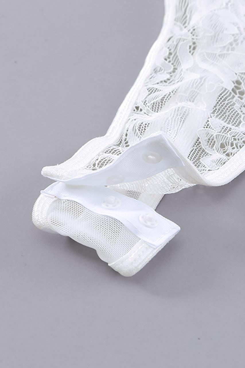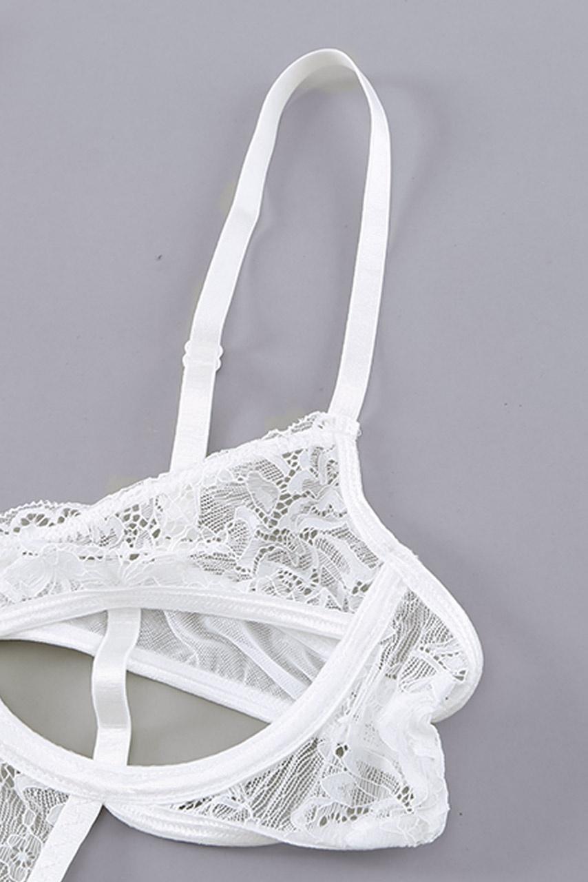 Vintage style body με λευκή ρομαντική δαντέλα, διαφάνεια πίσω και τολμηρά cut outs στο στήθος. Διαθέτει ρυθμιζόμενες τιράντες, high cut leg στο κάτω μέρος και κόπιτσες, ενώ τα ανοίγματα αναδεικνύουν κάθε σωματότυπο.
