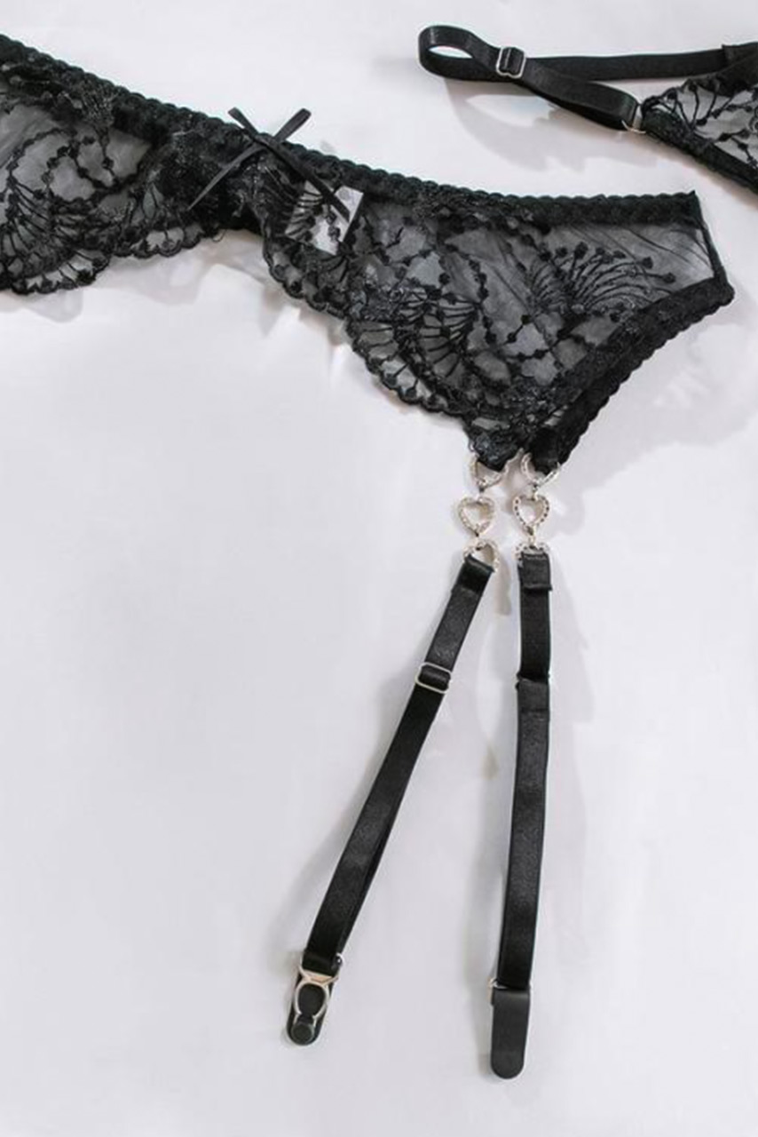 Lace σέξι διάφανο σετ εσωρούχων με ζαρτιέρες σε μαύρο χρώμα και με διακοσμητικές μεταλλικές καρδούλες.