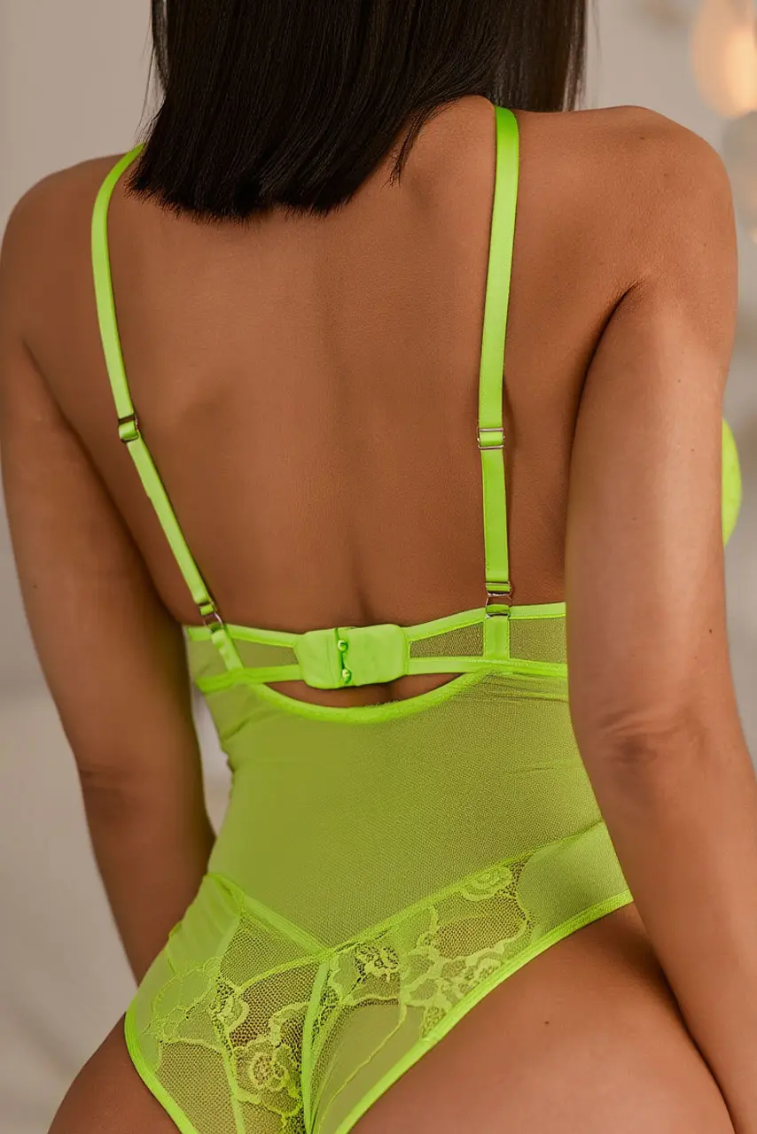 Το neon είναι εδώ και κάνει θόρυβο — κυριολεκτικά. Το λαχανί push-up κορμάκι με δαντέλα είναι η statement επιλογή που αναδεικνύει κάθε fashion rebel. Η έντονη φλούο απόχρωση, σε συνδυασμό με τα διαφανή κάθετα panels και τα λουλουδένια μοτίβα δαντέλας, δημιουργεί ένα εκρηκτικό αποτέλεσμα που δεν περνά απαρατήρητο.
