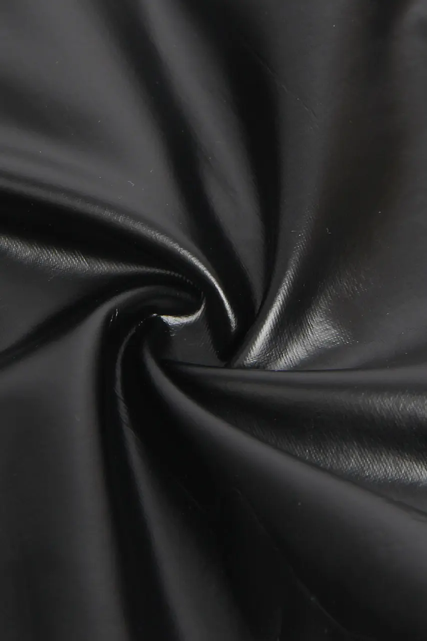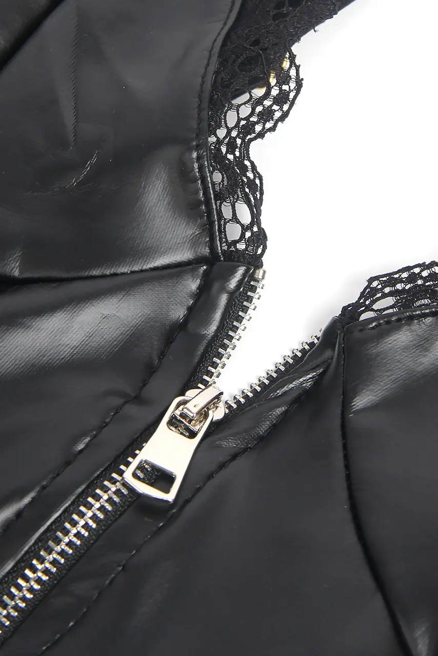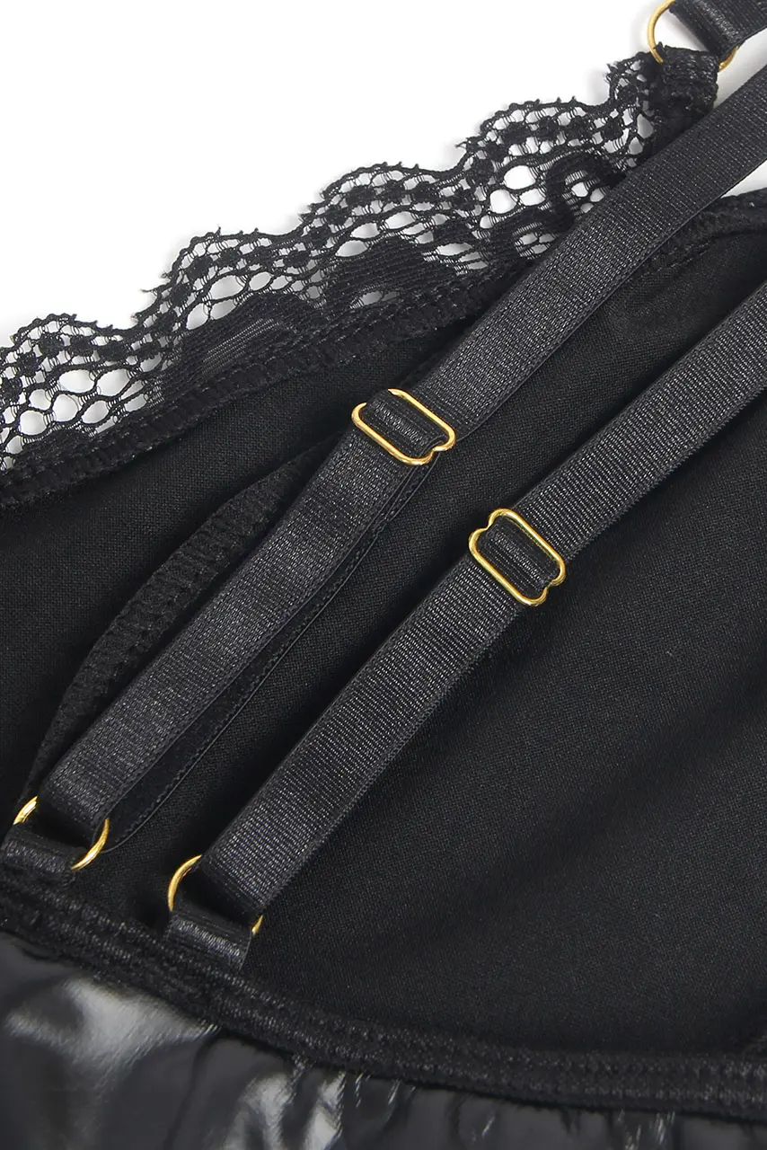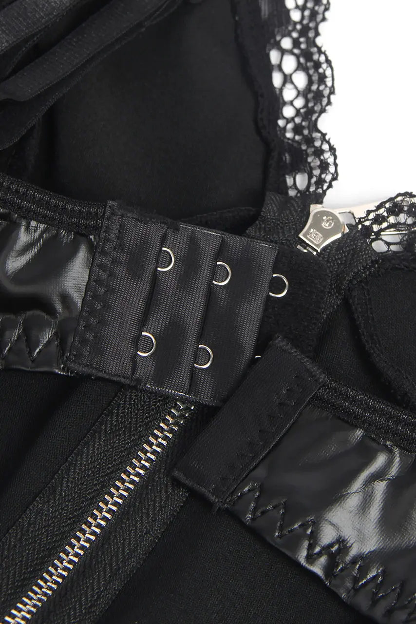 Ο κορσές από eco leather αγκαλιάζει τη σιλουέτα με δομημένη εφαρμογή, ενώ η V-γραμμή με δαντέλα στο μπούστο δημιουργεί το απόλυτο femme fatale αποτέλεσμα. Το χρυσό φερμουάρ στο κέντρο αναβαθμίζει το κομμάτι σε boudoir statement με functional twist.