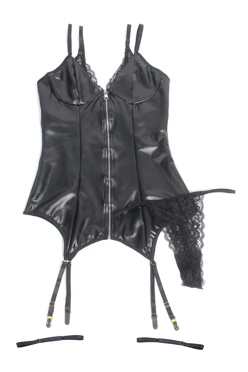 Μαύρο eco leather κορσέ σετ με φερμουάρ και ζαρτιέρες-1