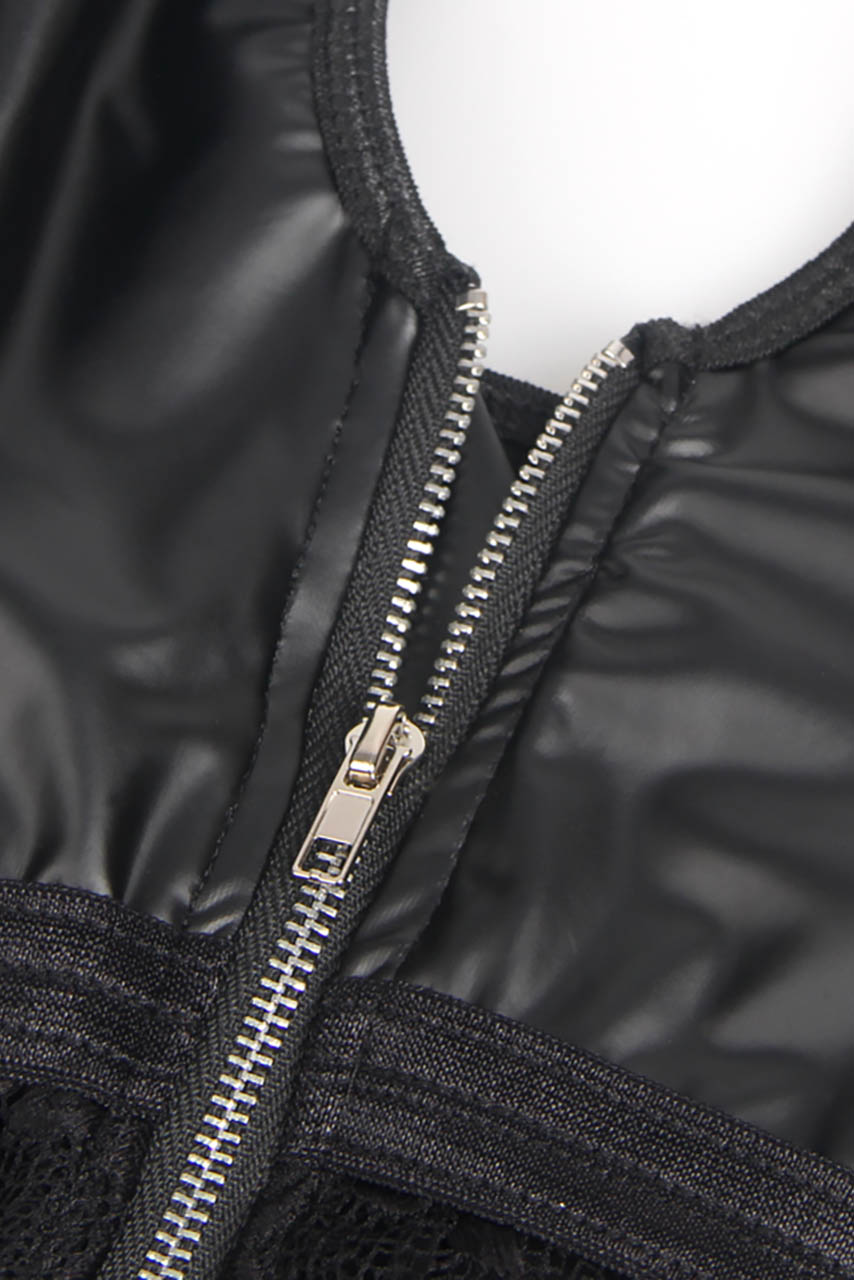 Αν το lingerie ήταν mood, αυτό το κορμάκι θα ήταν «σαρωτικά αισθησιακό». Το Halter faux δερμάτινο κορμάκι με δαντέλα και φερμουάρ σμιλεύει το σώμα με δυναμισμό και dark κομψότητα. Η γυαλιστερή υφή της δερματίνης στο μπούστο, σε halter γραμμή, δημιουργεί ένα θεαματικό ντεκολτέ με φερμουάρ μπροστά — για στιλ που κλείνει (ή ανοίγει) με attitude.