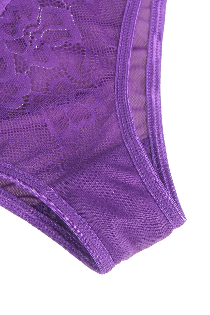 Δώστε μια σαγηνευτική και εκλεπτυσμένη πινελιά στη συλλογή εσωρούχων σας με αυτό το μοναδικό μωβ δαντελένιο σλιπ. Ο χαμηλόμεσος σχεδιασμός του αναδεικνύει τη θηλυκότητα, ενώ οι τριπλές strappy τιράντες στα πλαϊνά προσφέρουν μια τολμηρή και μοντέρνα λεπτομέρεια.