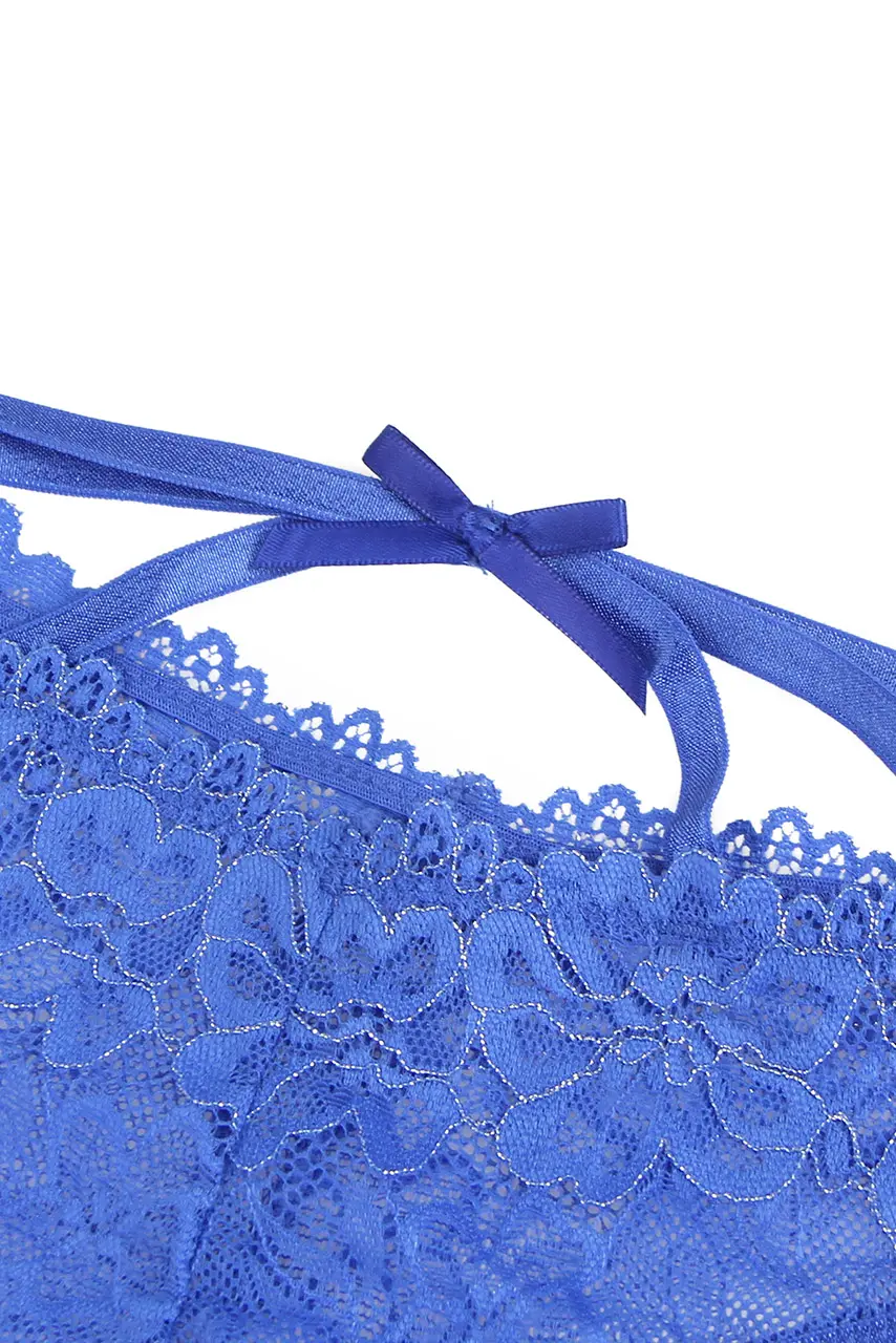 Ανακάλυψε τη σαγηνευτική πλευρά του εαυτού σου με το μπλε δαντελένιο σλιπ με ανοιχτό καβάλο. Η εκλεπτυσμένη floral δαντέλα συνδυάζεται με strappy λεπτομέρειες στο πίσω μέρος, ενώ το ανοιχτό σχέδιο αναδεικνύει τη θηλυκότητα και απογειώνει τον αισθησιασμό.
