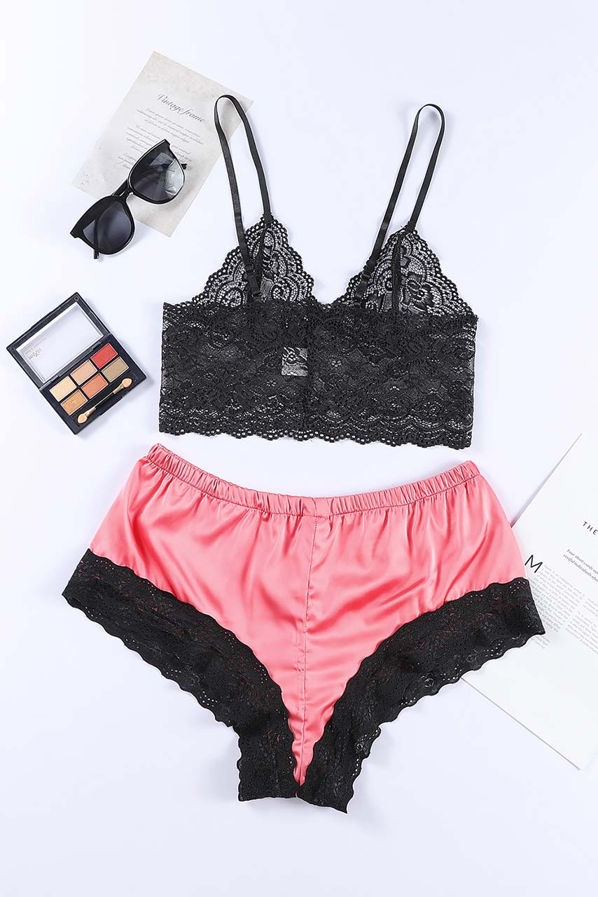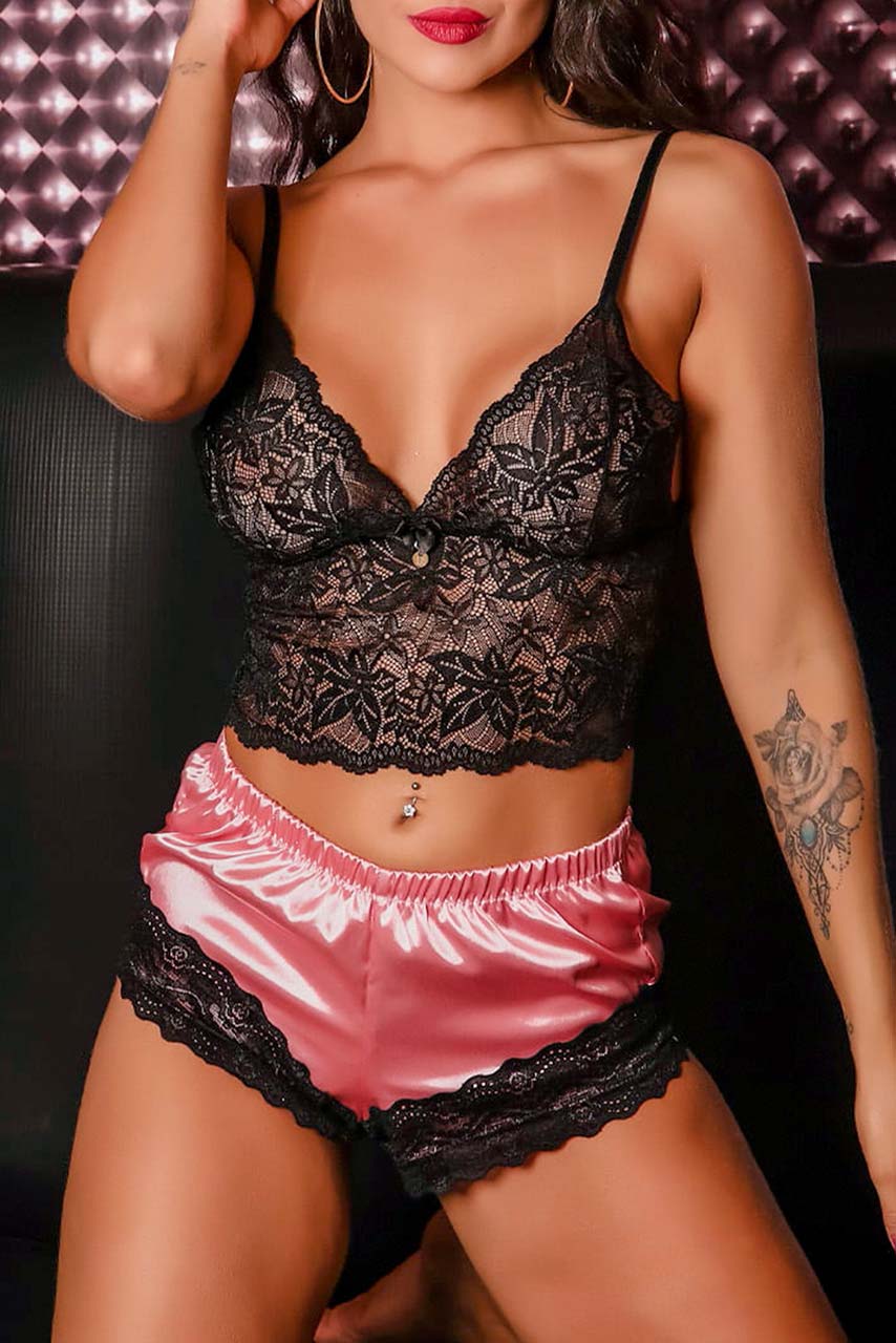Playfull lingerie σετ με corset top σε μαύρο χρώμα και satin hip style σλιπ σε φούξια.