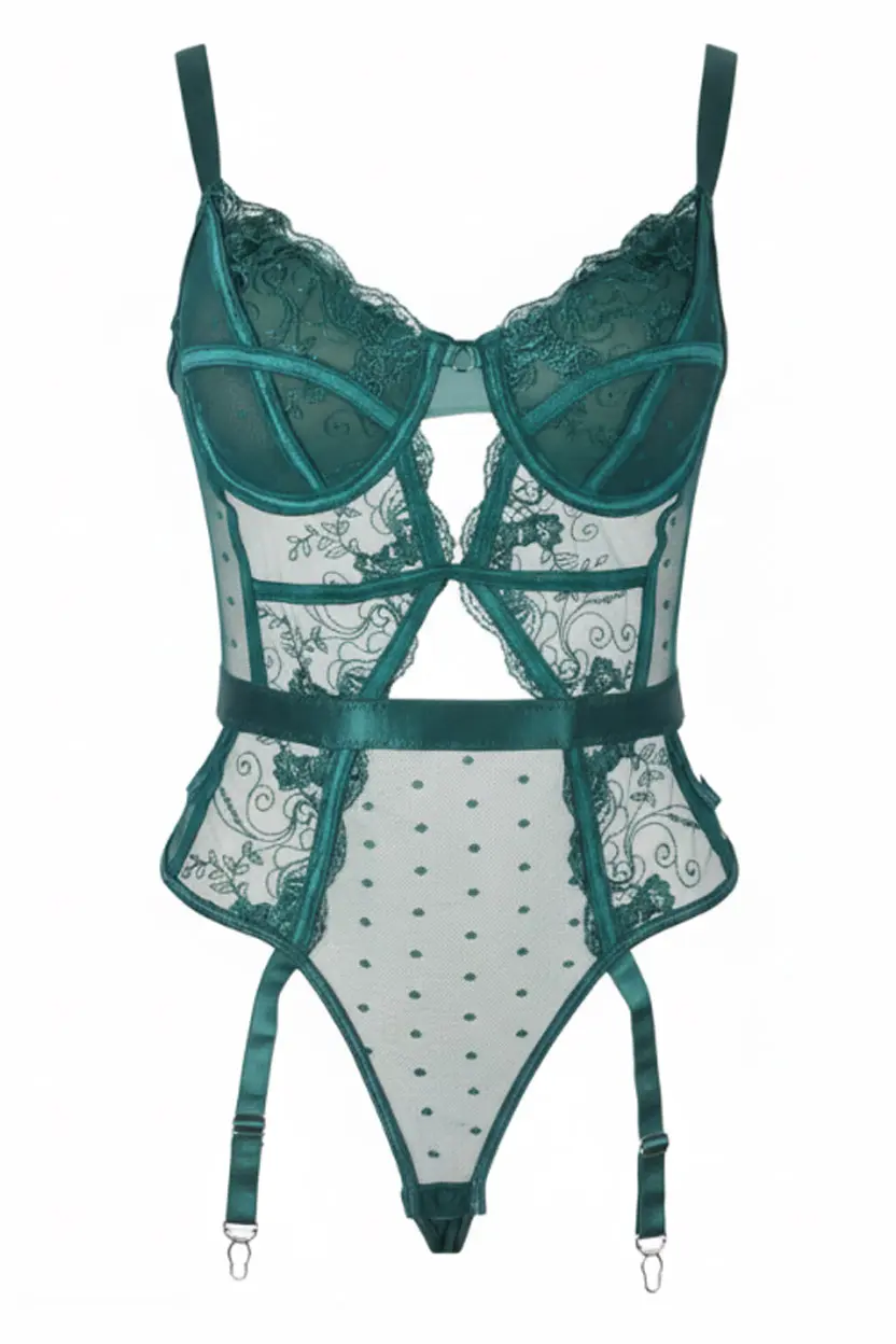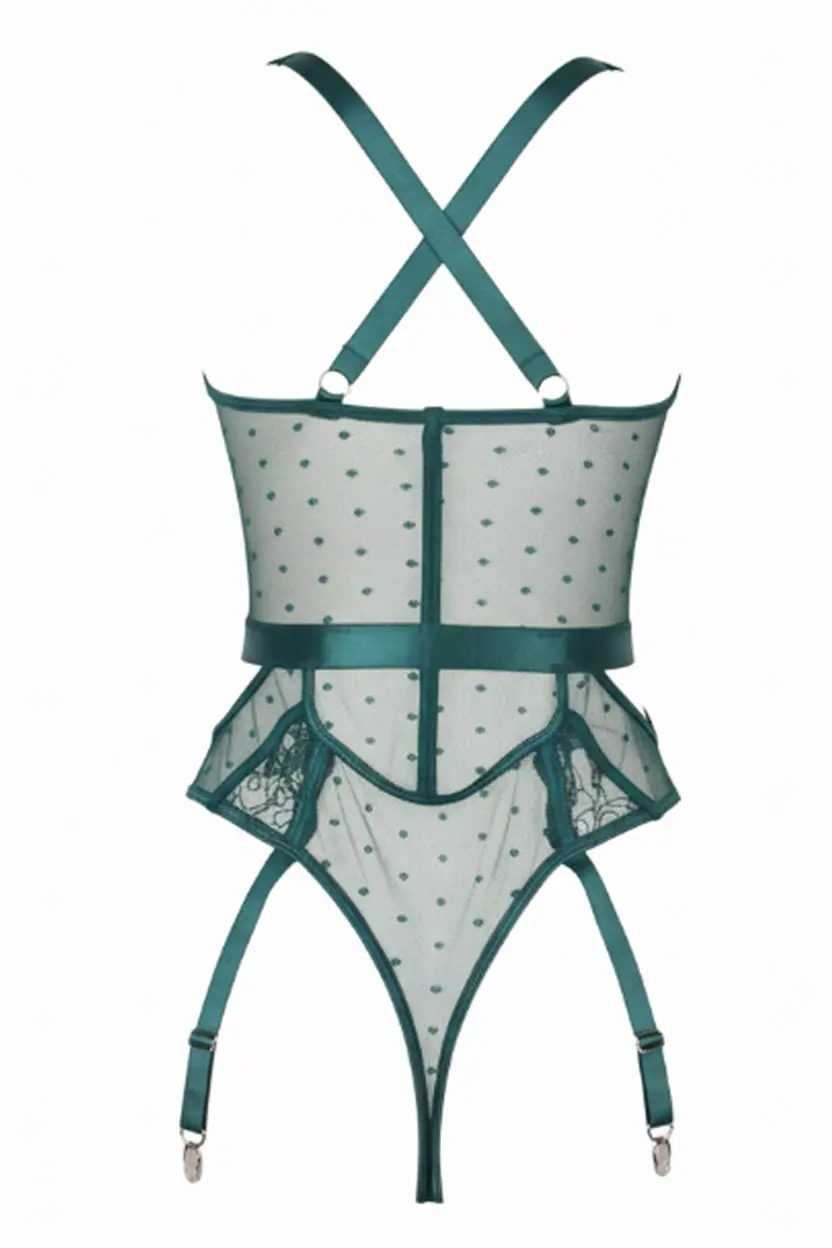 Η see-through βάση του με πουά σχέδιο σπάει τη μονοτονία με playful vibes, ενώ τα έντονα πράσινα δαντελένια cups φέρνουν στη μνήμη παλιό glam Hollywood, αλλά με μια μοντέρνα αισθητική. Οι ενσωματωμένες ζαρτιέρες προσθέτουν ακαταμάχητη ένταση, κάνοντας το κάθε βήμα σου… pure seduction.