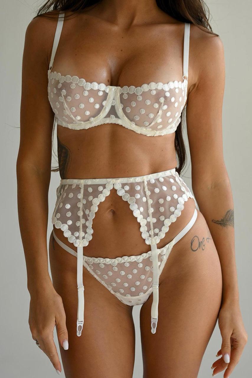 Ρετρό vintage σετ εσωρούχων με mesh πουά διαφάνειας all over, bra top σουτιέν, thong slip και ζαρτιέρες.