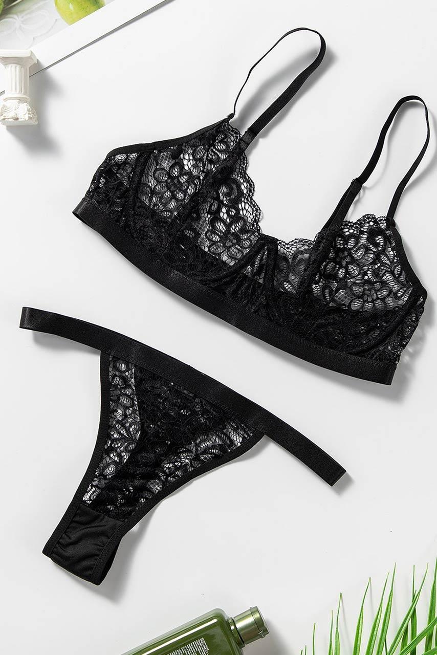 Romantic μαύρο σετ με all over δαντέλα, bra top top και thong σλιπ.