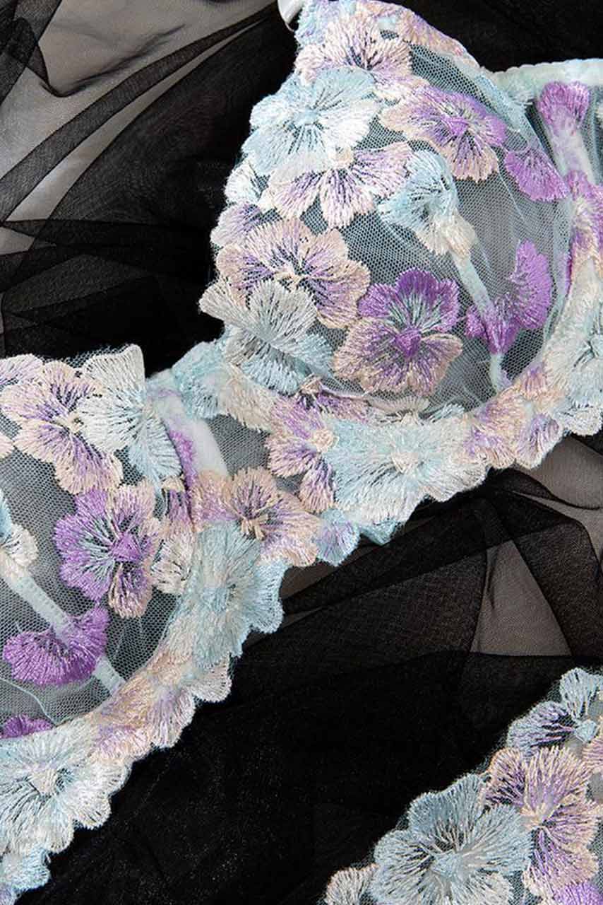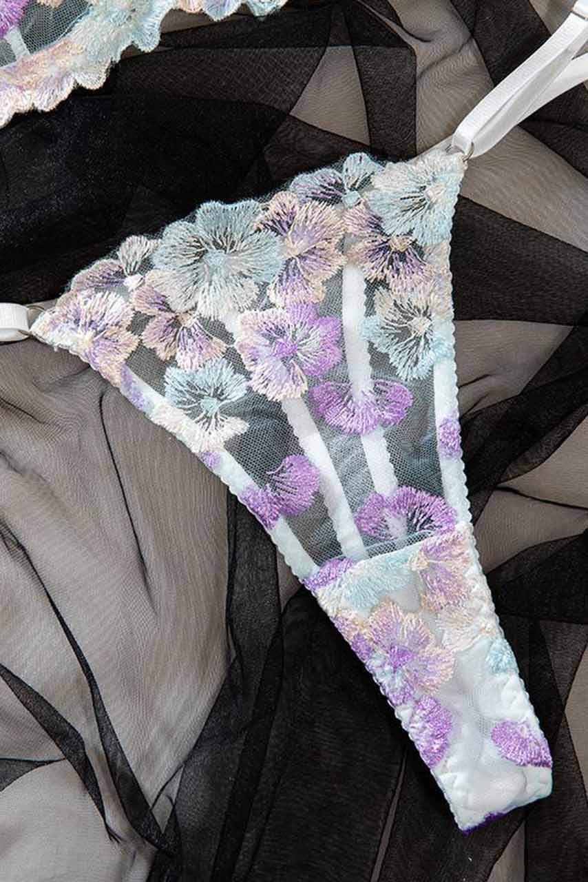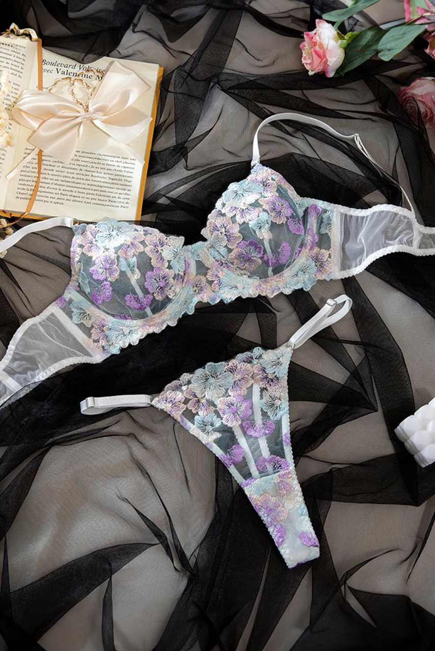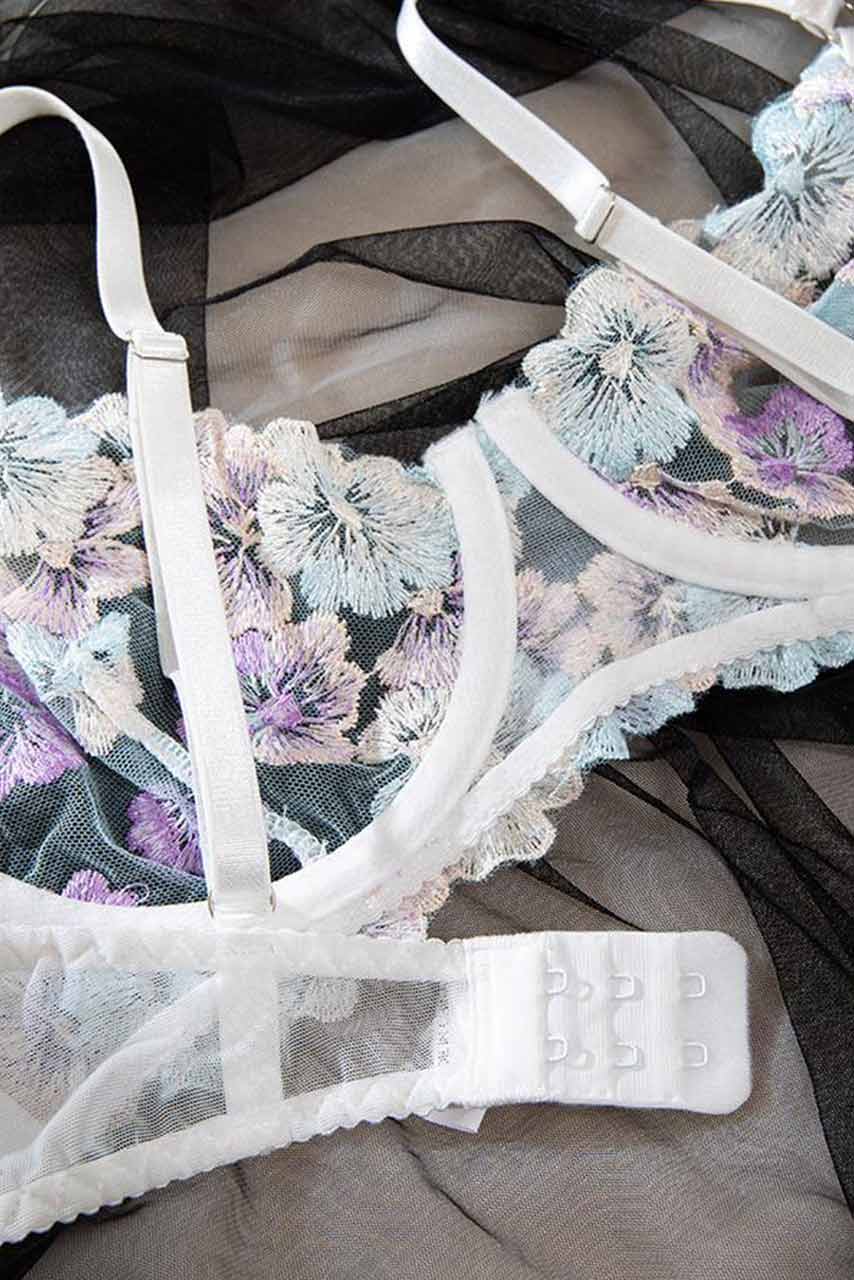 Λευκό σετ εσωρούχων με διαφάνεια και λουλουδάκια. Το σουτιέν είναι τύπου μπουστάκι με ρυθμιζόμενες τιράντες και κούμπωμα στην πλάτη.