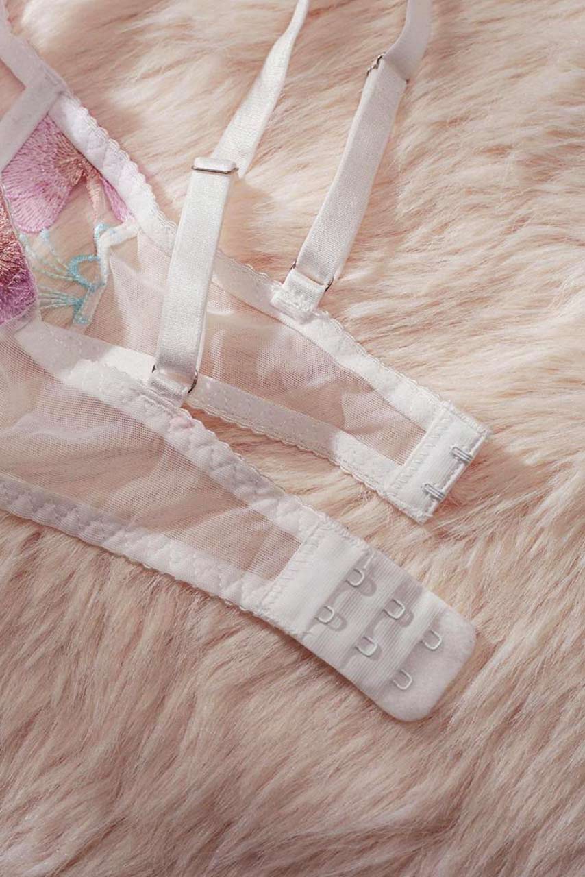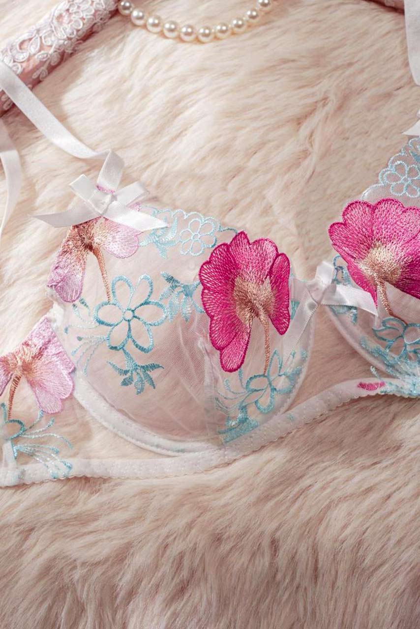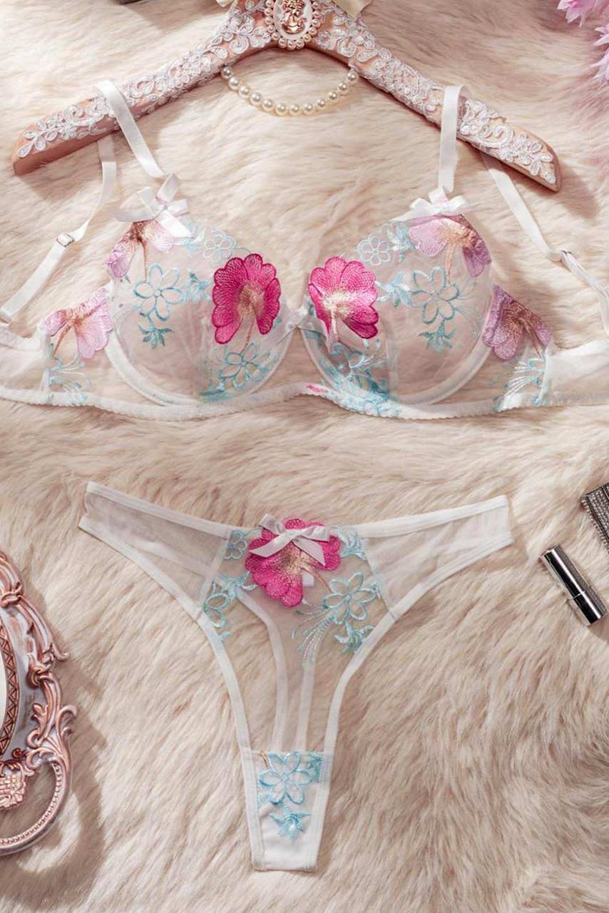 Διάφανο ρομαντικό σετ εσωρούχων σε λευκή απόχρωση με κεντημένα πολύχρωμα λουλουδάκια. Το σλιπάκι ειναι στρινγκ και το σουτιέν διαθέτει μπανέλα.