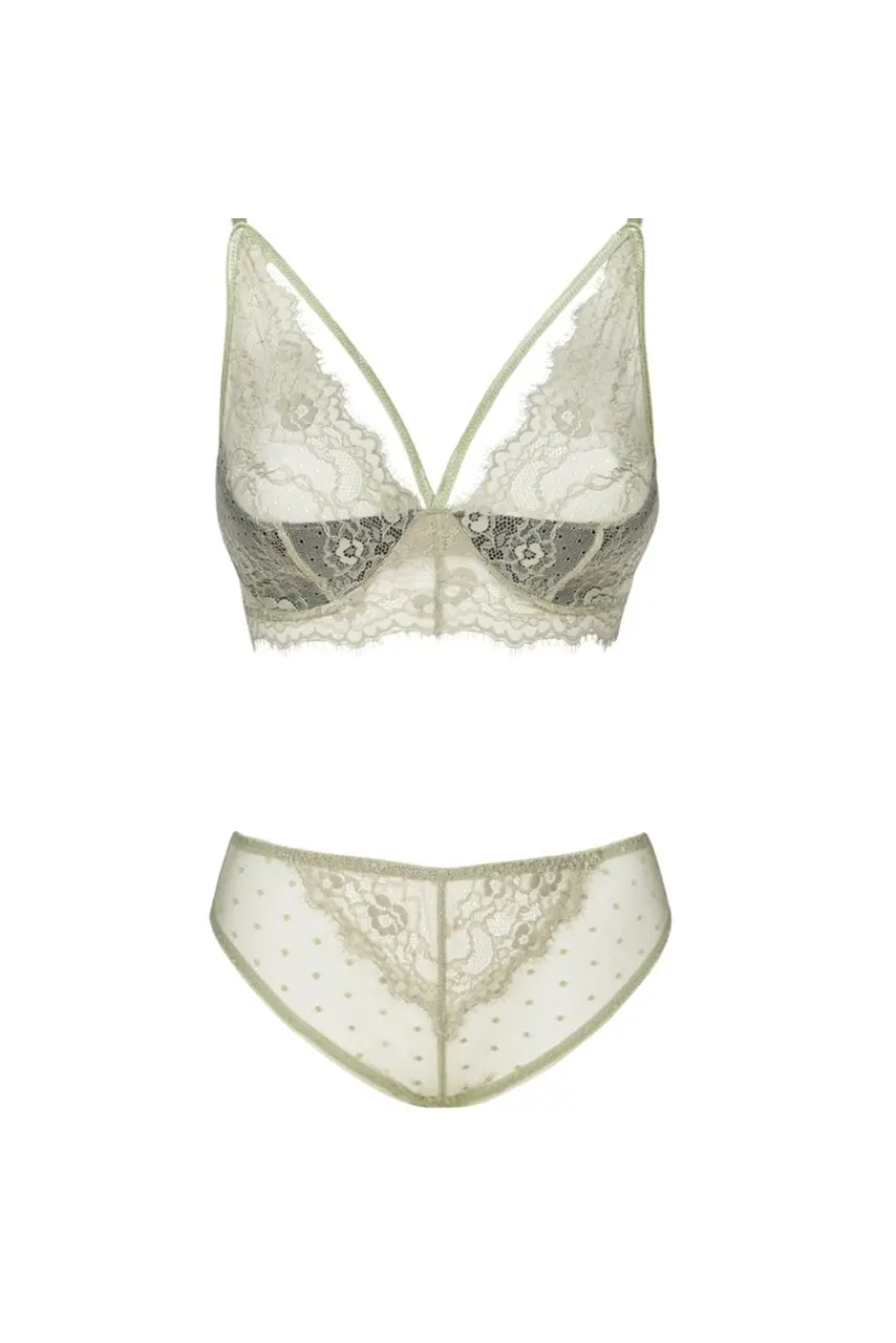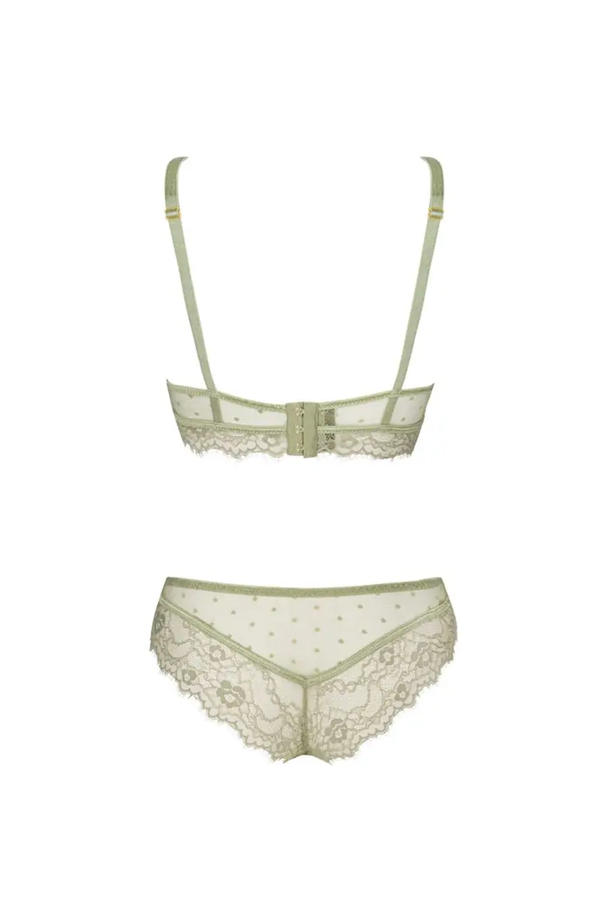 Το σετ εσωρούχων είναι ένα δαντελένιο έργο τέχνης. Το σουτιέν δεν είναι ενισχυμένο και είναι επιπλέον εξοπλισμένο με δύο λουράκια στο ντεκολτέ, έτσι ώστε όταν προβάλλει κάτω από πουκάμισο ή μπλούζα, να τραβάει σίγουρα μεγάλη προσοχή. Το σουτιέν υποστηρίζει καλά το στήθος, πράγμα που σημαίνει ότι και οι γυναίκες με μεγαλύτερο στήθος θα μπορούν να το φορέσουν. Το δελεαστικό εσώρουχο σε απόχρωση του πράσινου περιλαμβάνει επίσης άνετο και ταυτόχρονα αισθησιακό δαντελένιο σλιπ, το οποίο, παρόλο που είναι ελαφρώς πιο κλειστό, δημιουργεί μια σέξι ατμόσφαιρα. Ο σχεδιασμός του σλιπ αναδεικνύει τέλεια τους γυναικείους γλουτούς, κάνοντας κάθε γυναίκα να αισθάνεται ξεχωριστή. Το σετ είναι ιδανικό για καθημερινή χρήση καθώς και για πιο ιδιαίτερες στιγμές.