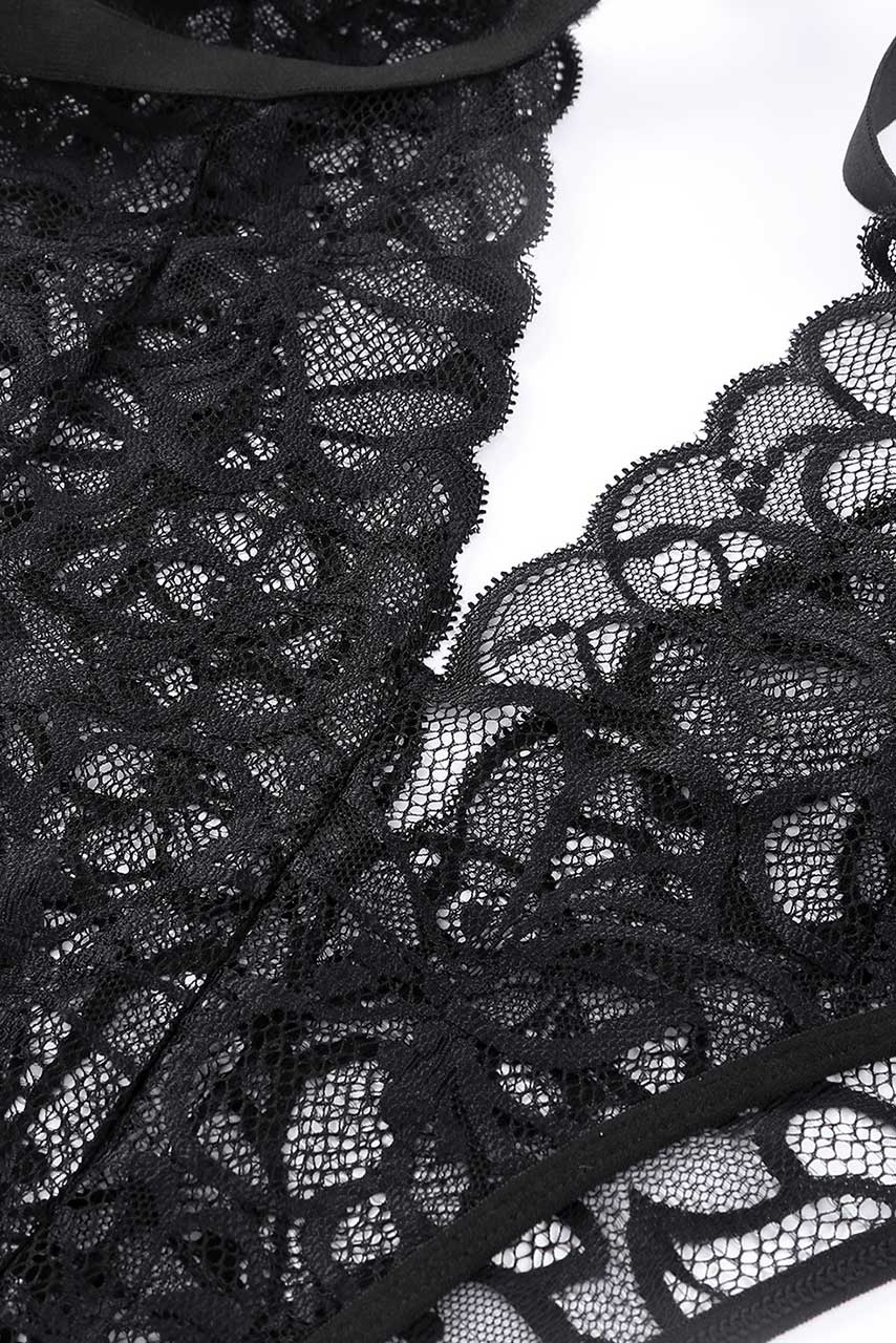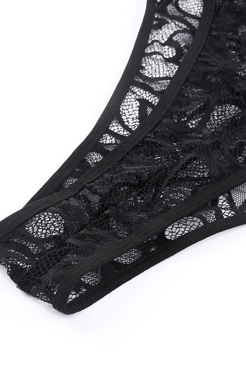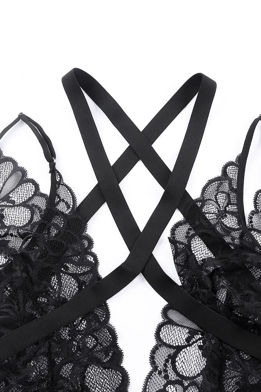 See through μαύρο ολόσωμο backless κορμάκι, με cut outs και straps που σχηματίζουν χιαστί και all over ντελικάτη δαντέλα και garter belt ζώνη με ζαρτιέρες.
