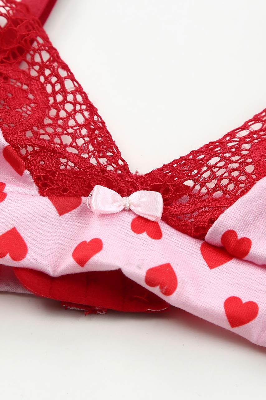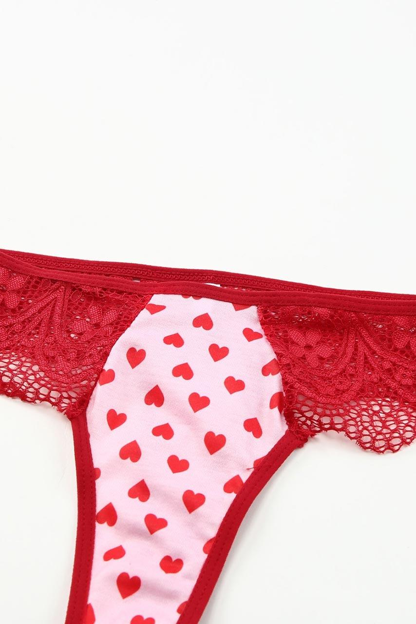 Ρομαντικό σετάκι 3 τεμαχίων με καρδούλες και δαντέλα. Το σουτιέν έχει ρυθμιζόμενες τιράντες και το σλιπάκι είναι στρίνγκ.
