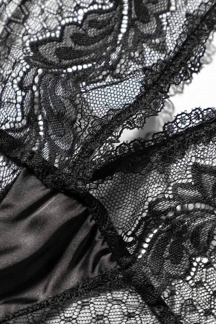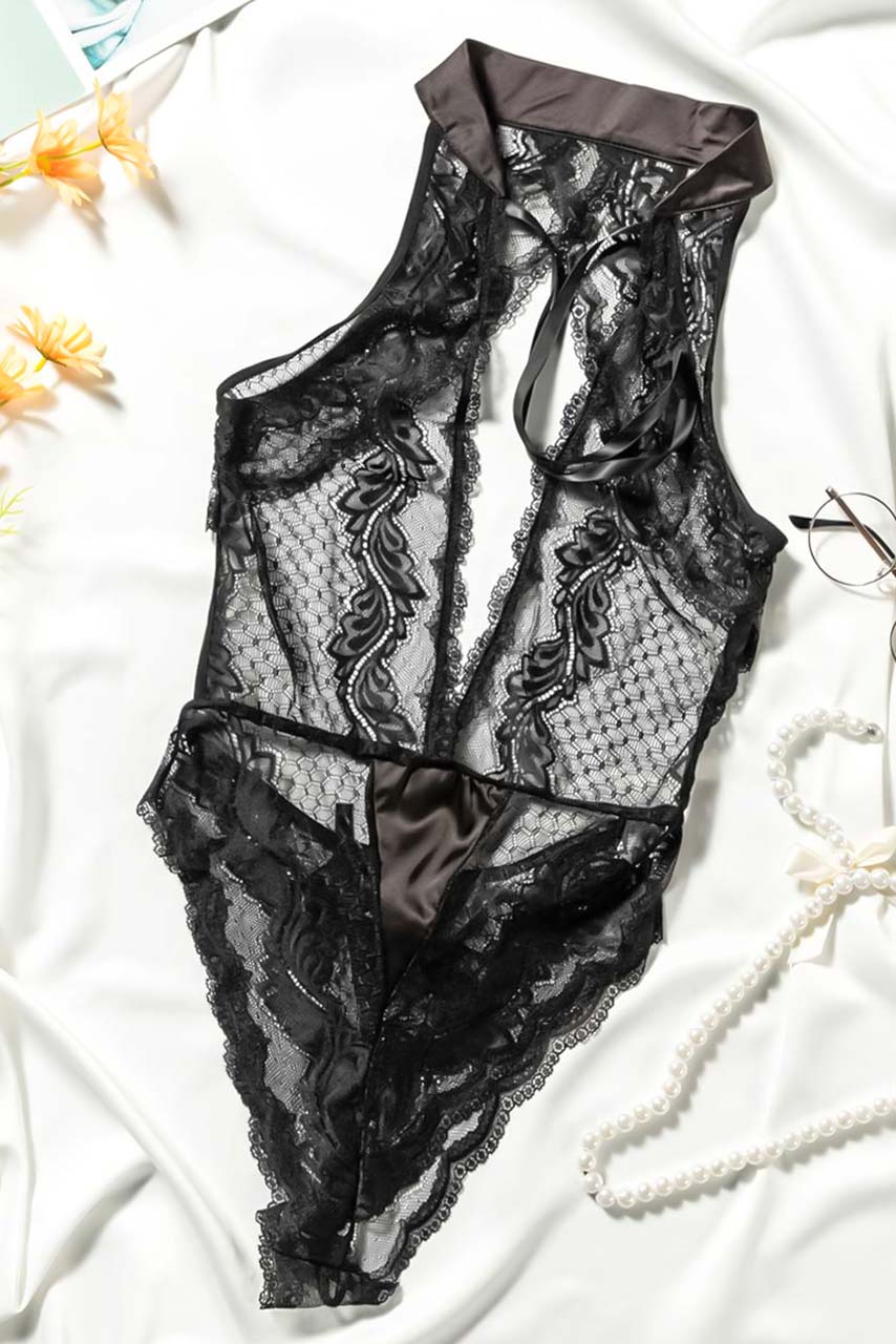 Ημιδιάφανο lace κορμάκι σε μαύρη απόχρωση με βαθύ ντεκολτέ και γιακά που δένει στο λαιμό με satin κορδόνια. High cut bottoms με lace up δέσιμο από πίσω.