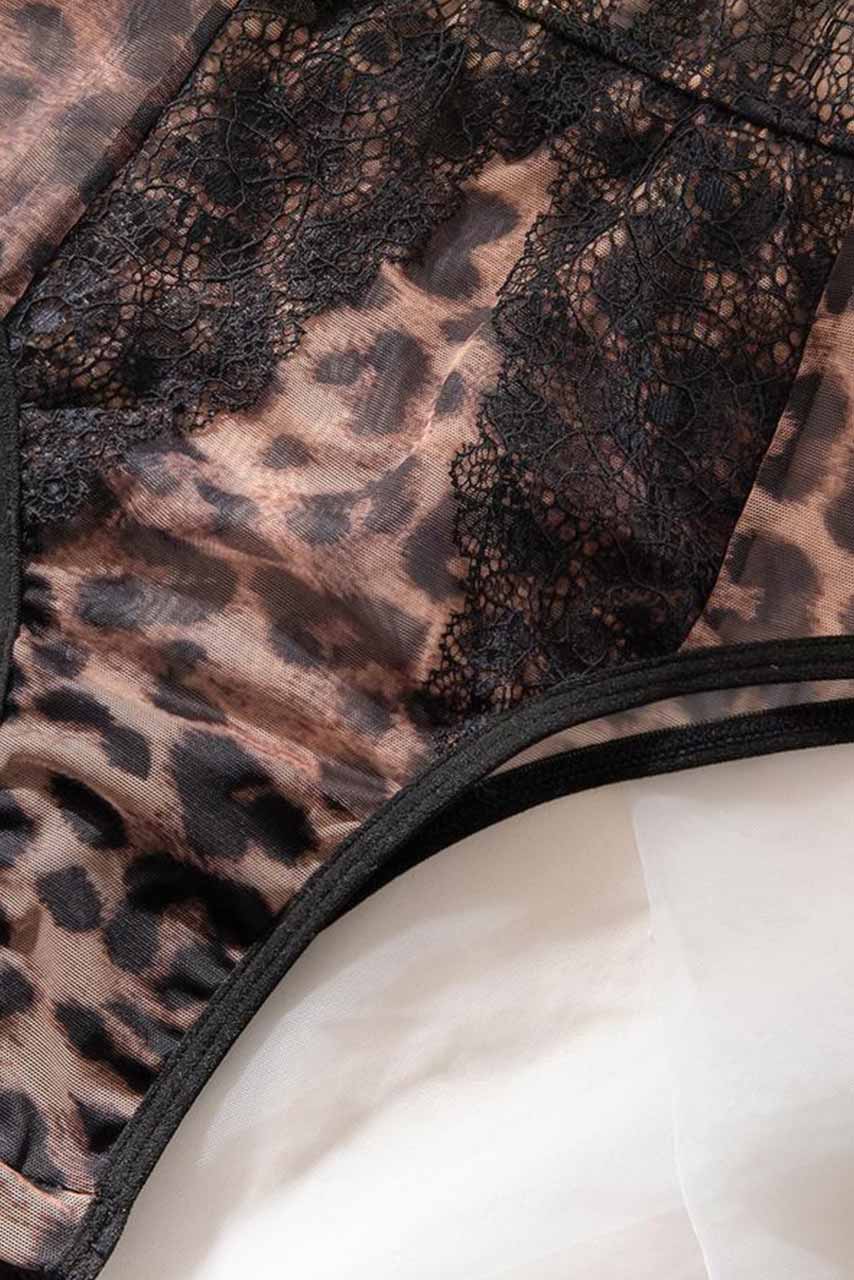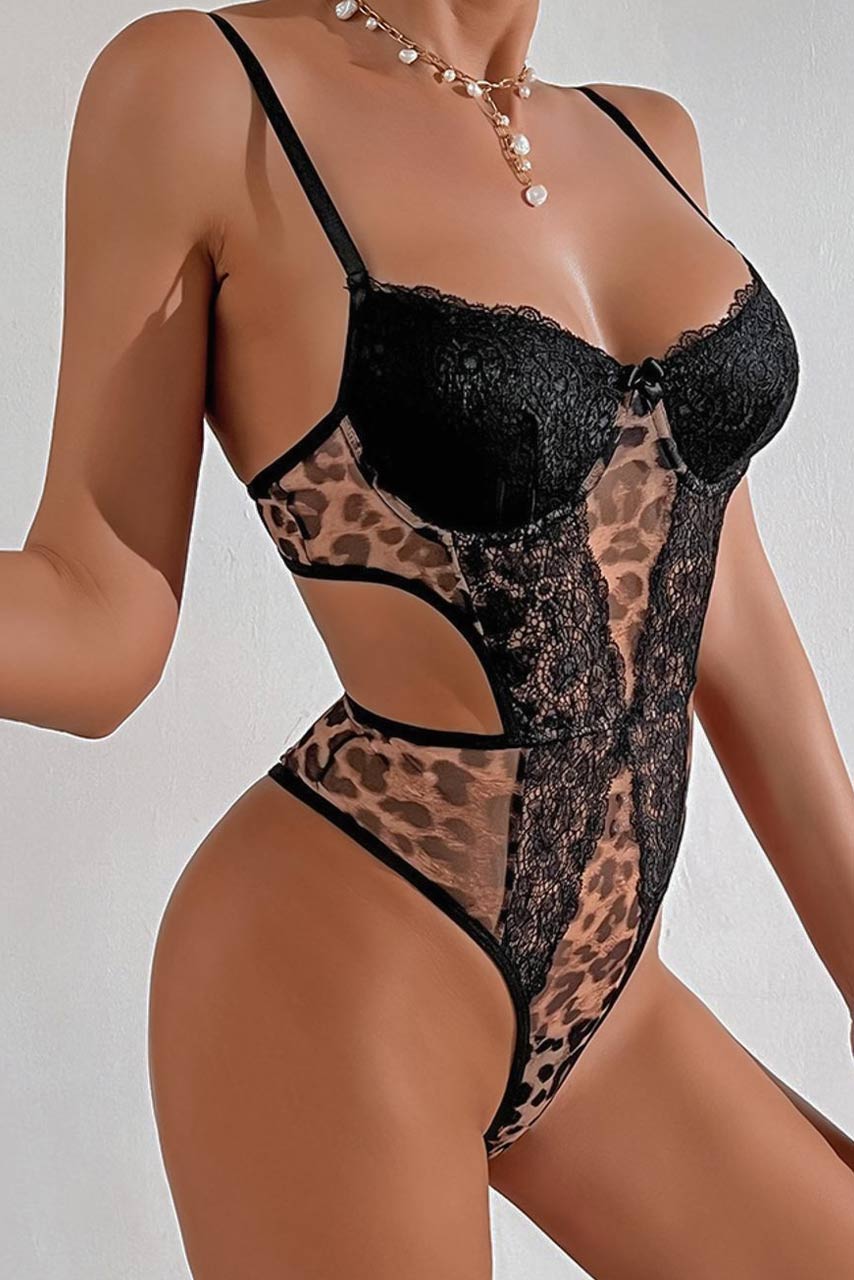 Στυλάτο ημιδιάφανο κορμάκι με λεπτομέρειες δαντέλας με σχέδιο λεοπάρ. Έχει μαύρα δαντελωτά cups με ρυθμιζόμενες λεπτές τιράντες, κοψίματα στα πλάγια και high cut bottom. Είναι ιδανικό για ιδιαίτερες εμφανίσεις.