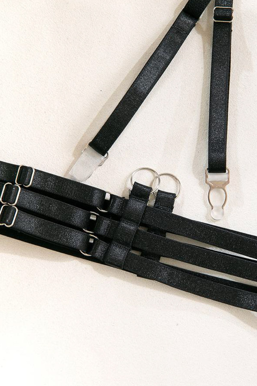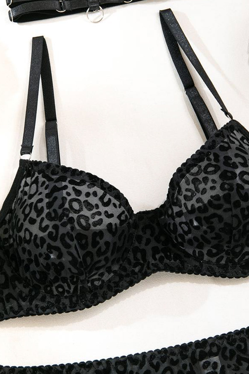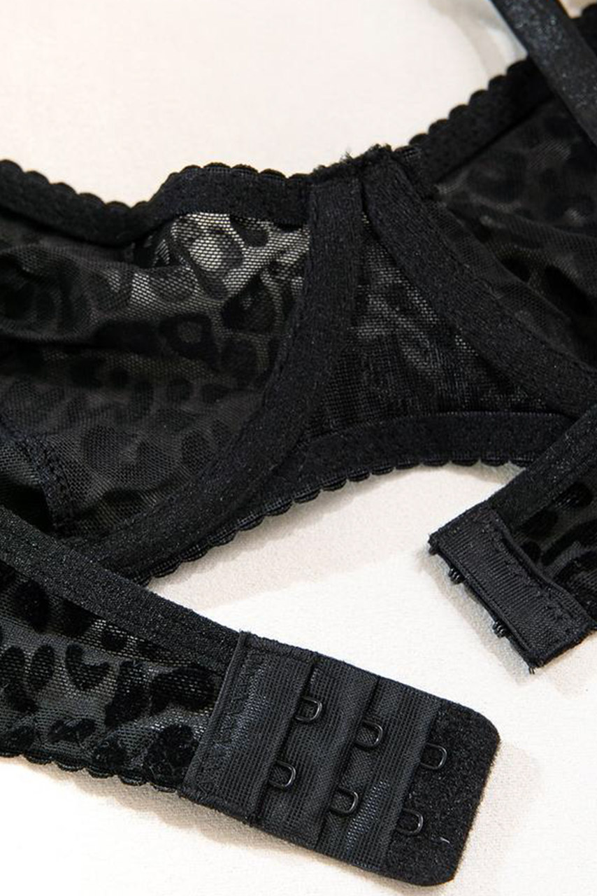 Μαύρο διάφανο σετ εσωρούχων με mesh leopard tights. Έχει balconette σουτιέν με ρυθμιζόμενες τιράντες και μπανέλα, ζαρτιέρα με καλτσοδέτες και ψηλόμεσο ασορτί thong σλιπ.