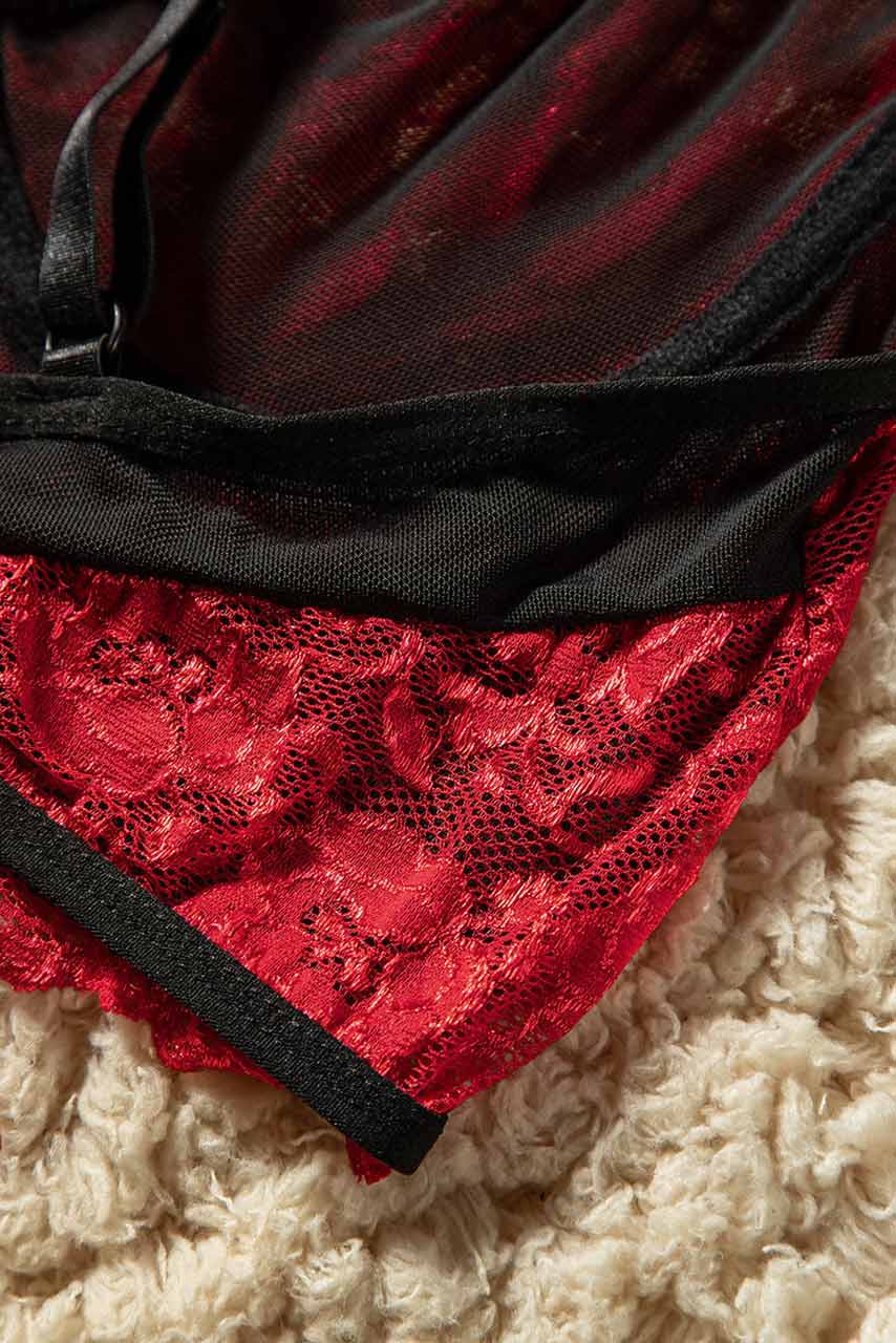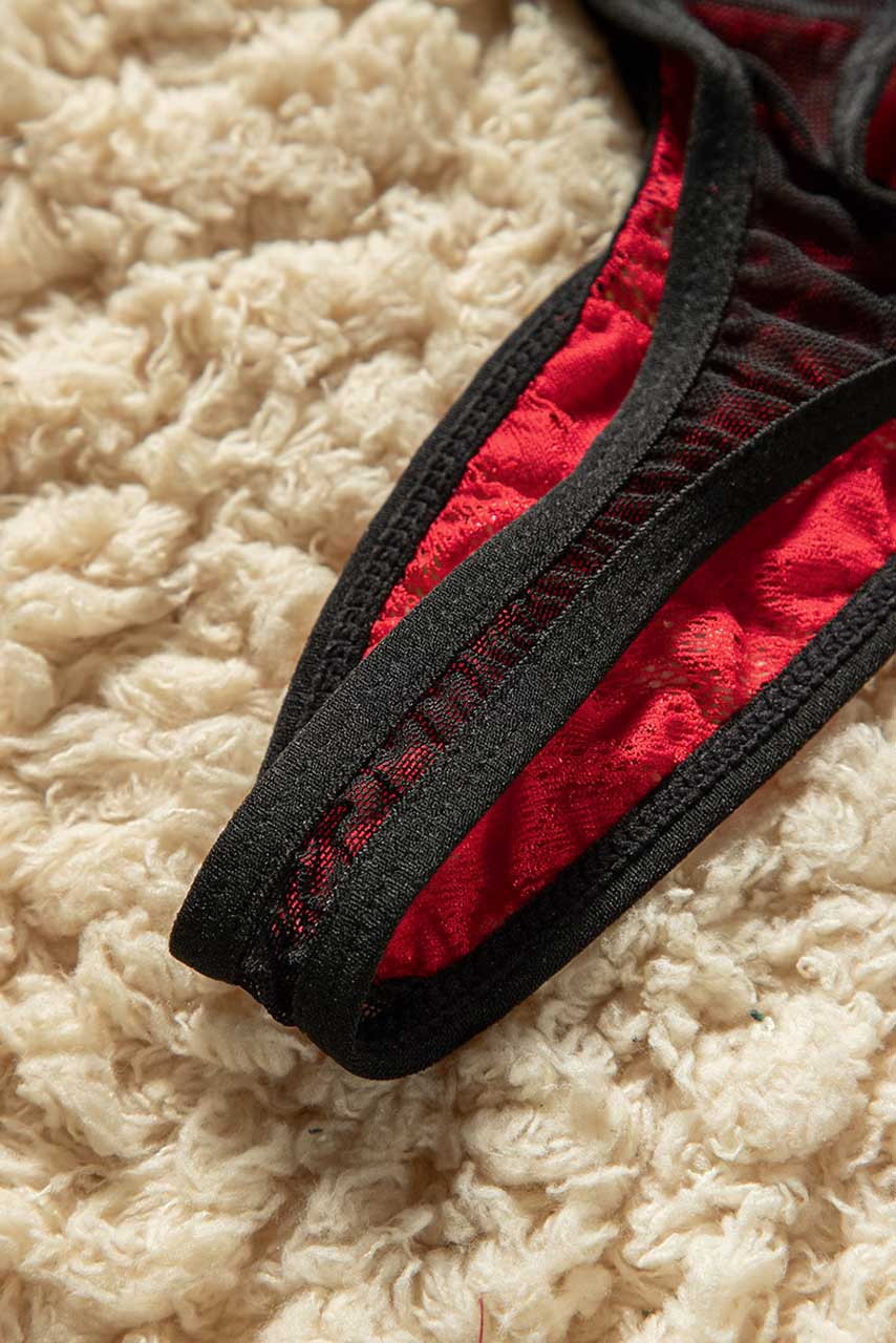 Σετ εσωρούχων με strappy cropped σουτιέν σε ιδιαίτερο μοτίβο από τα τελευταία lingerie trends και cut out G σλιπ με φλοράλ δαντέλα σε κόκκινο.