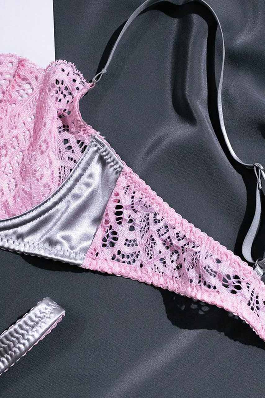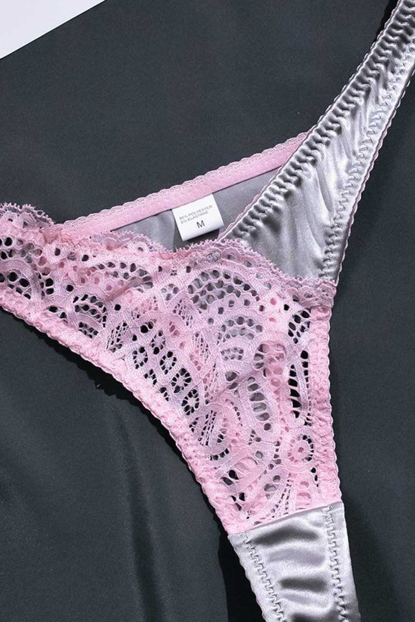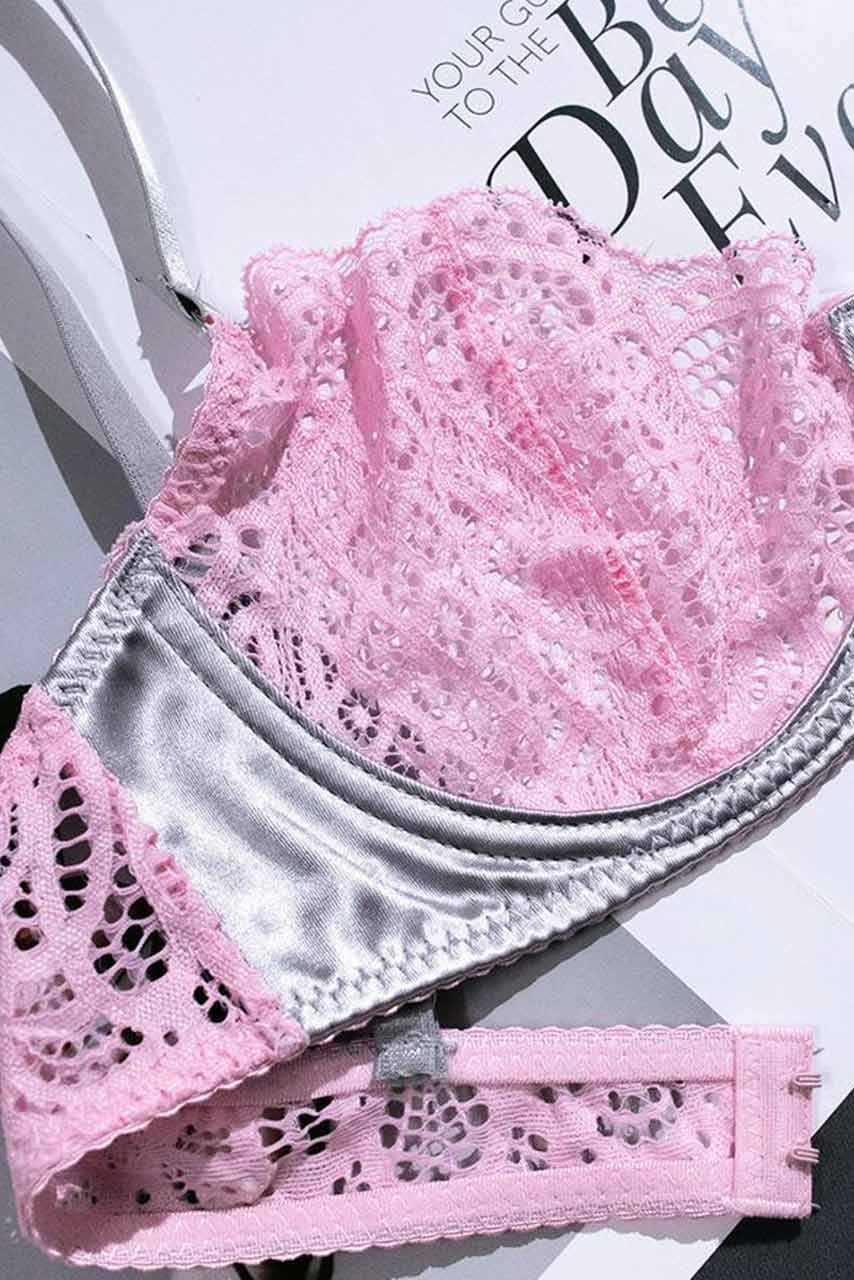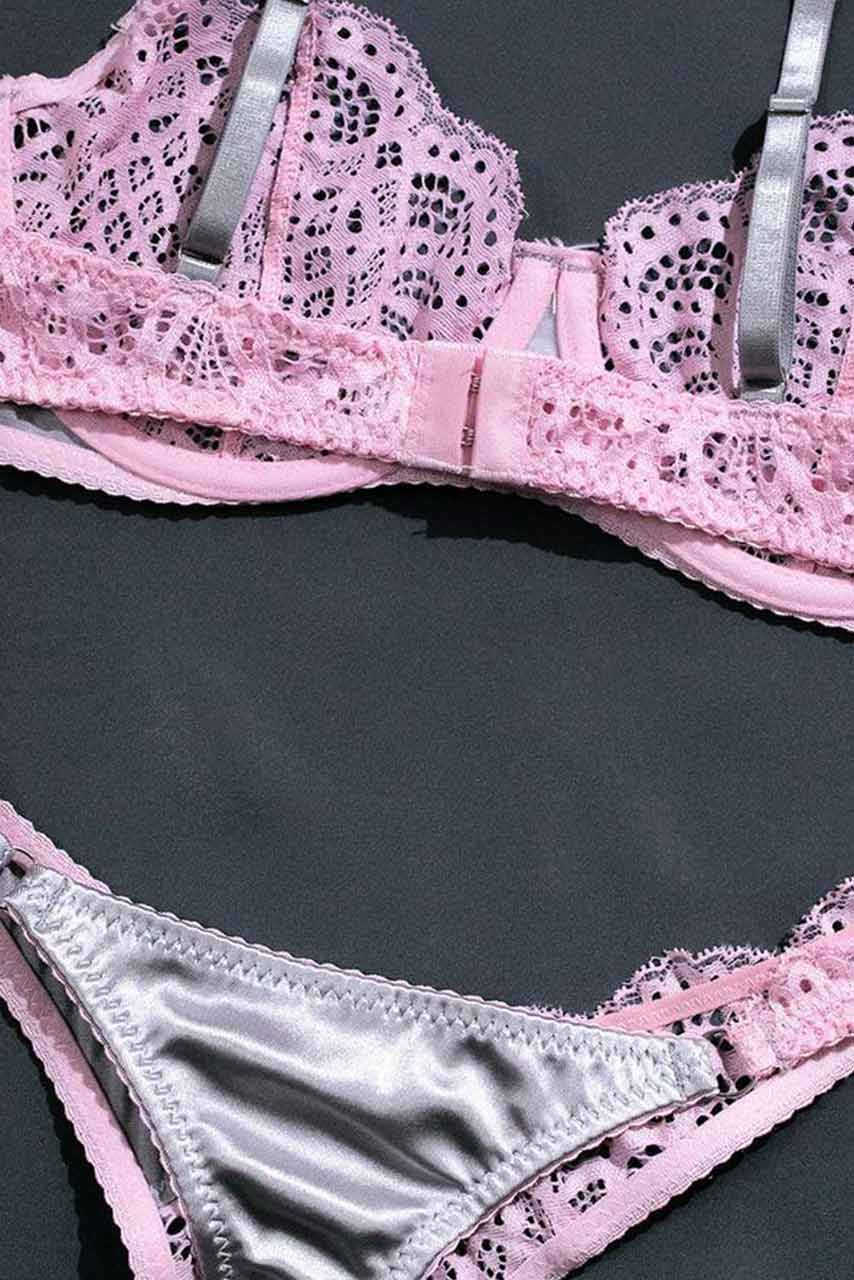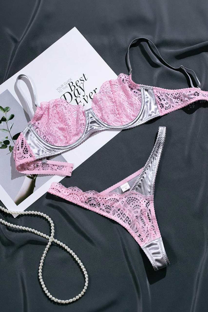 Glam σετ balconette από δαντέλα σε απαλό ροζ και ασημί stretch σατέν με ρυθμιζόμενες τιράντες και high cut σλιπάκι.