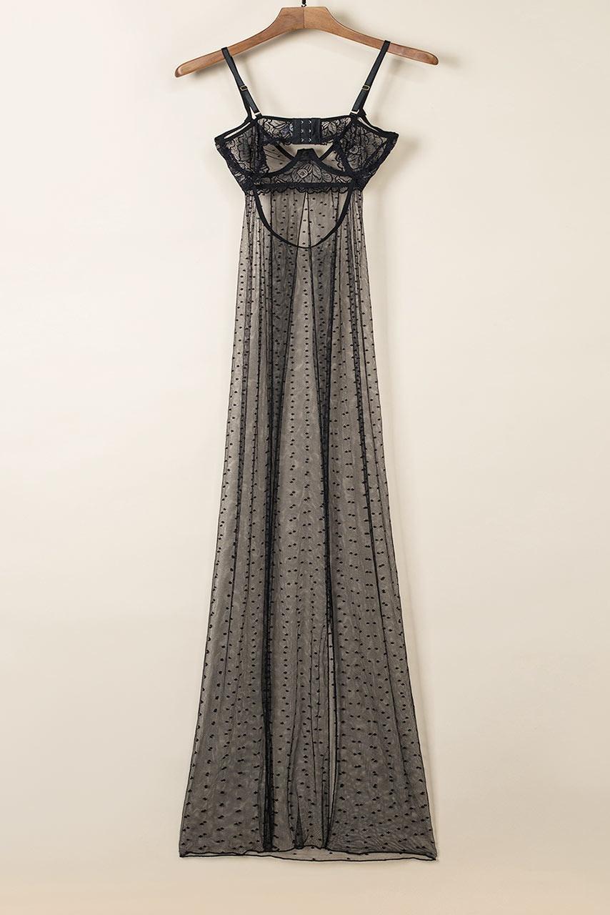 Ρετρό vintage maxi lingerie νυχτικό πουά με διαφάνεια σε μαύρη απόχρωση με μπανέλες, χωρίς ενίσχυση με πολύ λεπτές τιράντες.