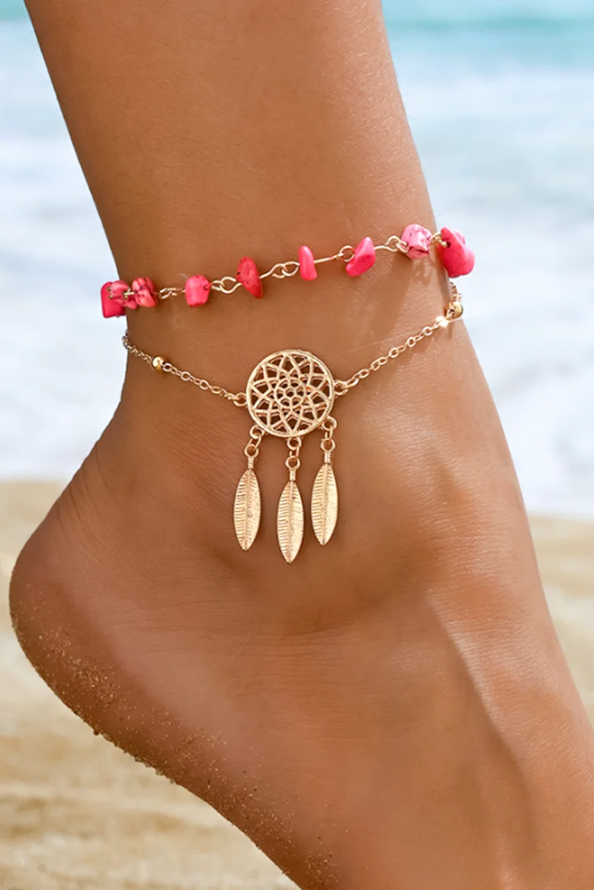 Αλυσίδα ποδιού με ροζ πέτρες και ονειροπαγίδα