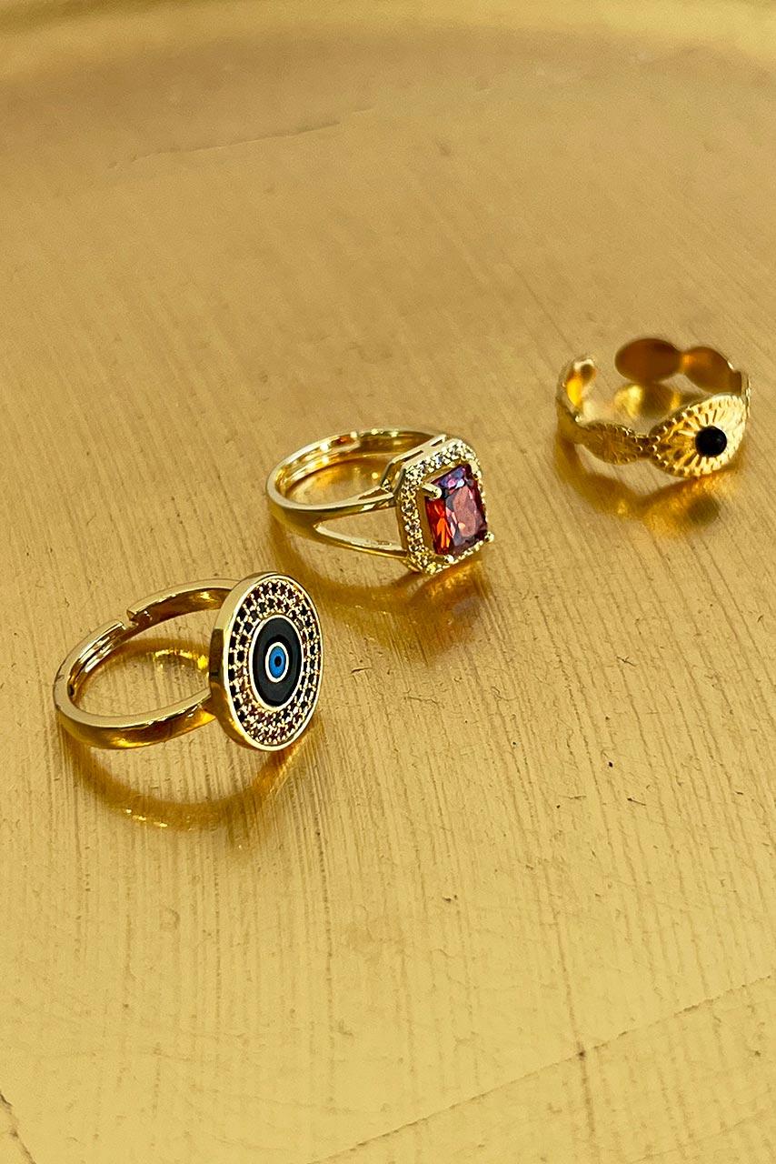 Boho σετ δαχτυλιδιών σε faux χρυσή απόχρωση με ένα μπλε eye of evil σχέδιο, ένα με πέτρα και ένα με μαύρο ματάκι. Συνδυάστε τα με το Σετ χρυσά δαχτυλίδια για over styling boho outfit και με την Χρυσή snake chain για ultimate looks!