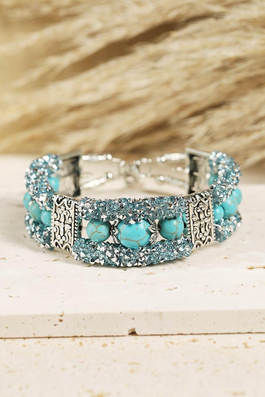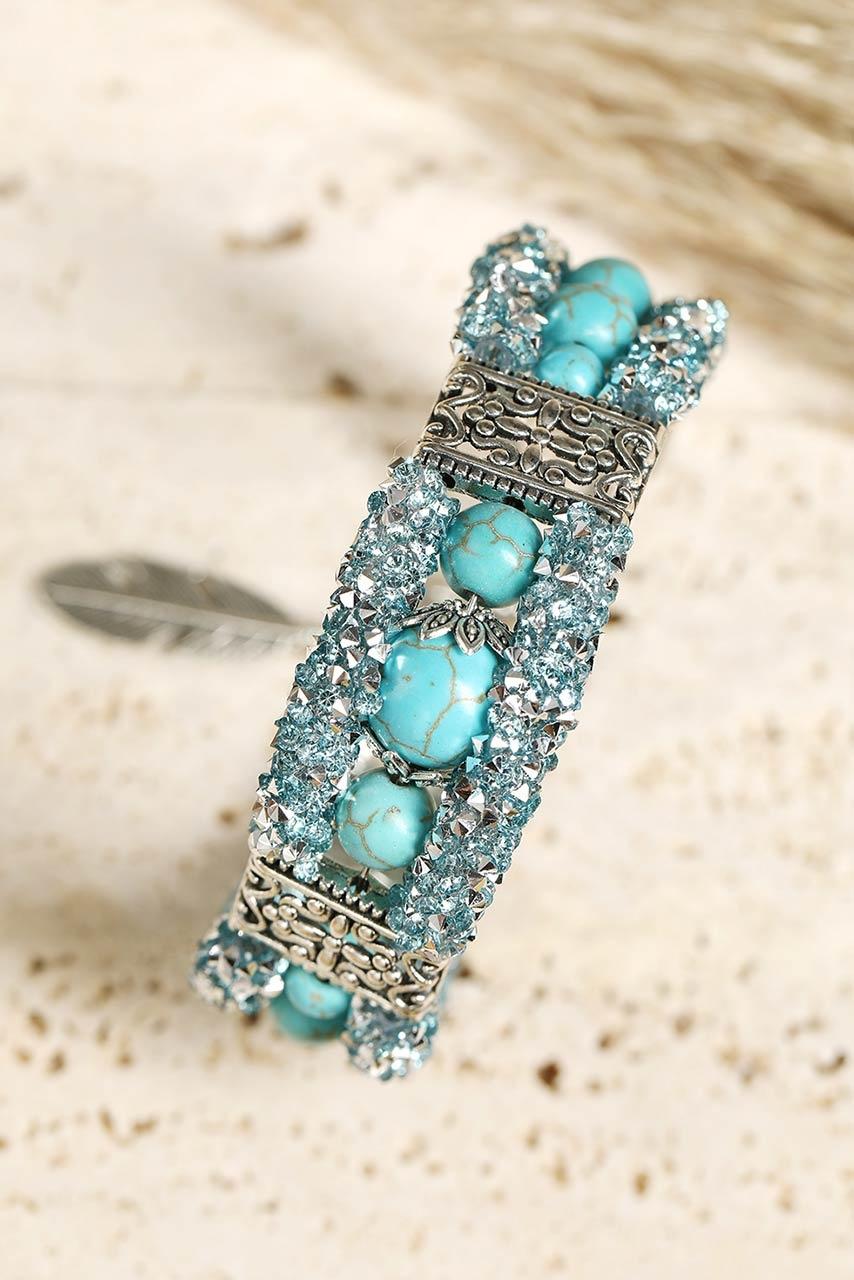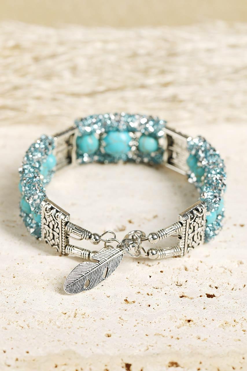 Τιρκουάζ με silver βραχιόλι με χάντρες και γυάλινο στρας. Έχει ιδιαίτερα στοιχεία σε boho ύφος. Μια ιδιαίτερη επιλογή για κάθε γυναίκα που της αρέσουν τα bohemian styles και το πιο ενδιαφέρον στυλ στη σύγχρονη μόδα.